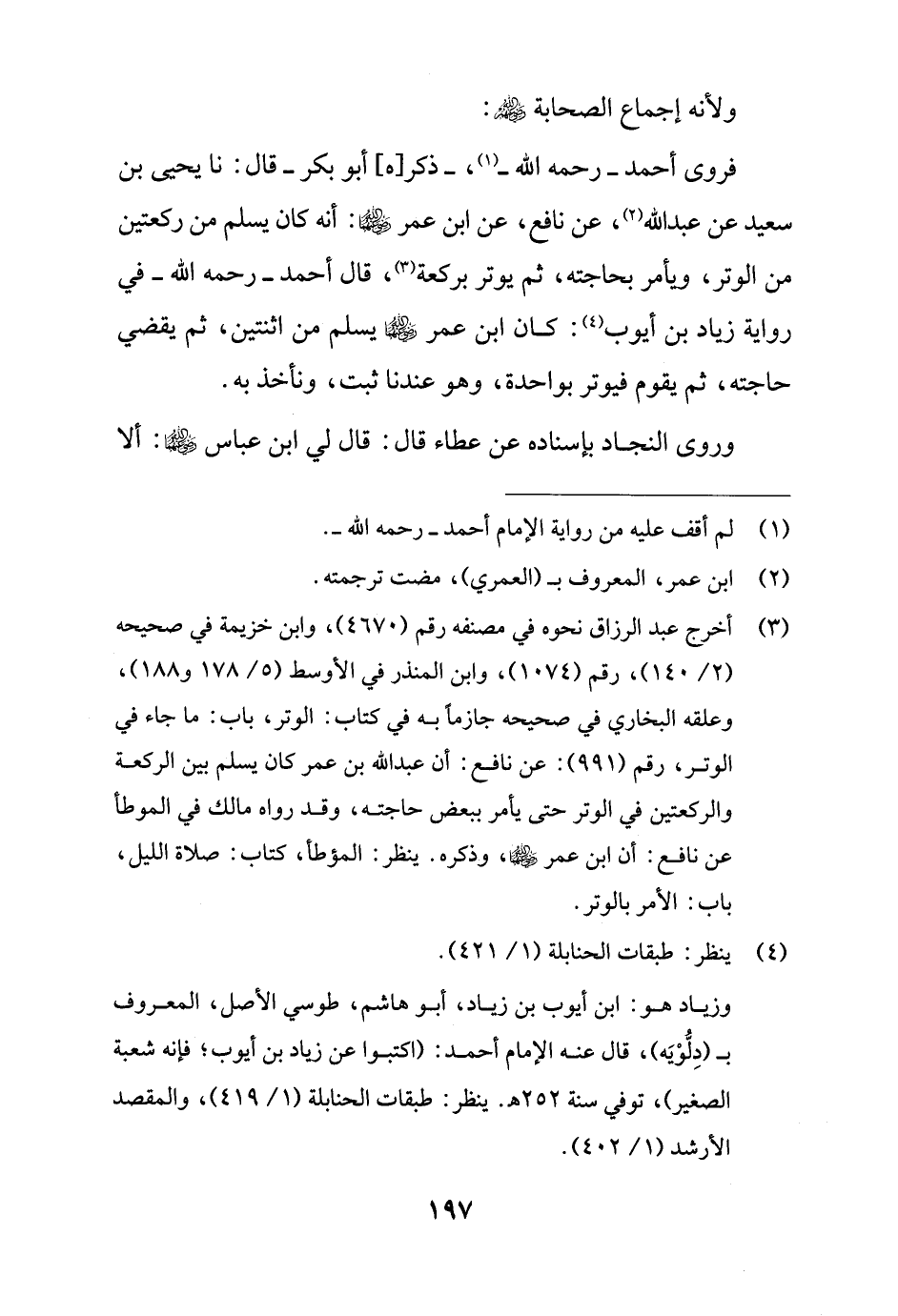 (¬3) أخرج عبد الرزاق نحوه في مصنفه رقم (4670)، وابن خزيمة في صحيحه (2/ 140)، رقم (1074)، وابن المنذر في الأوسط (5/ 178 و 188)، وعلقه البخاري في صحيحه جازمًا به في كتاب: الوتر، باب: ما جاء في الوتر، رقم (991): عن نافع: أن عبد الله بن عمر كان يسلم بين الركعة والركعتين في الوتر حتى يأمر ببعض حاجته، وقد رواه مالك في الموطأ عن نافع: أن ابن عمر - رضي الله عنهما -، وذكره. ينظر: الموطأ، كتاب: صلاة الليل، باب: الأمر بالوتر.