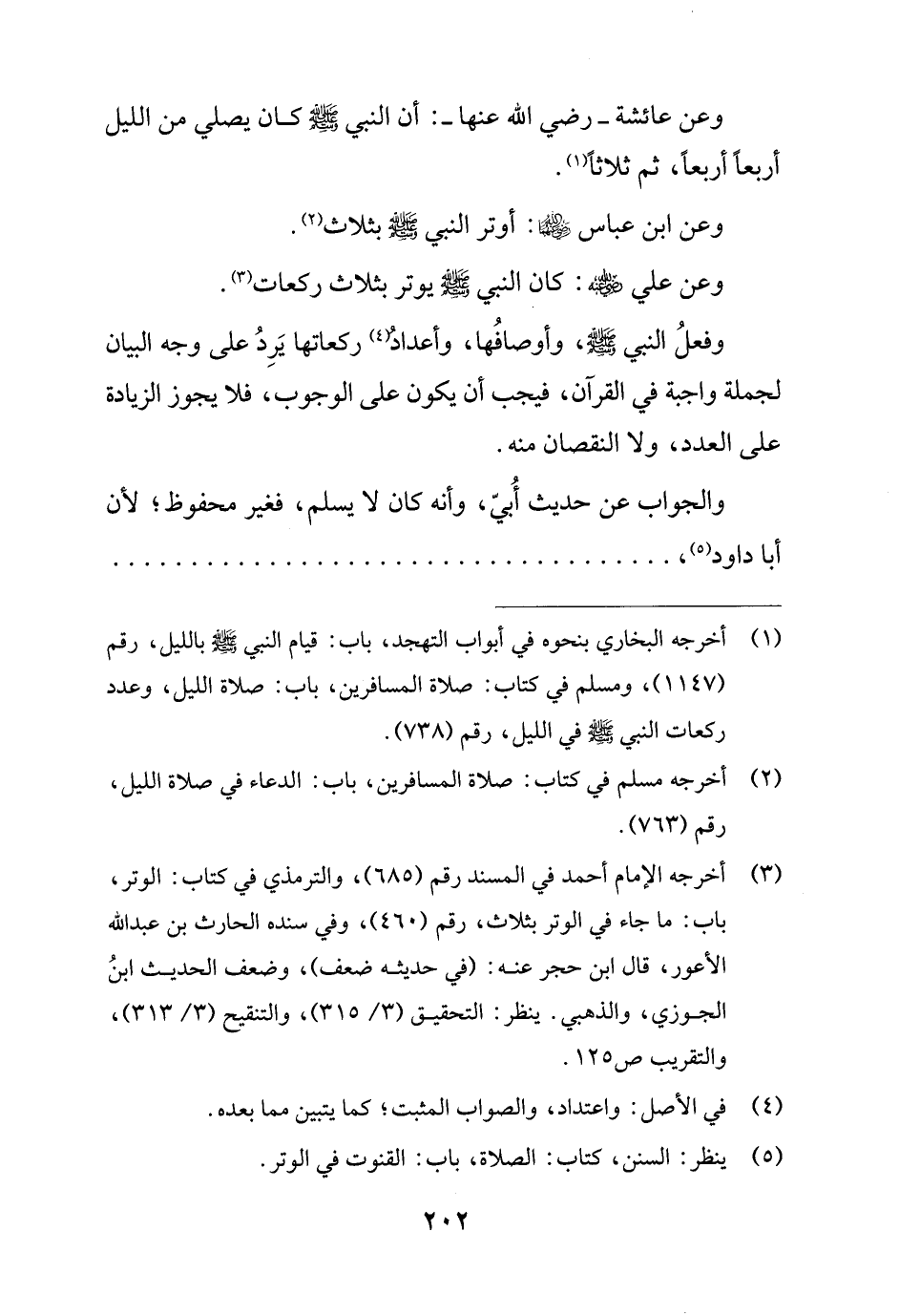 (¬3) أخرجه الإمام أحمد في المسند رقم (685)، والترمذي في كتاب: الوتر، باب: ما جاء في الوتر بثلاث، رقم (460)، وفي سنده الحارث بن عبد الله الأعور، قال ابن حجر عنه: (في حديثه ضعف)، وضعف الحديث ابنُ الجوزي، والذهبي. ينظر: التحقيق (3/ 315)، والتنقيح (3/ 313)، والتقريب ص 125.