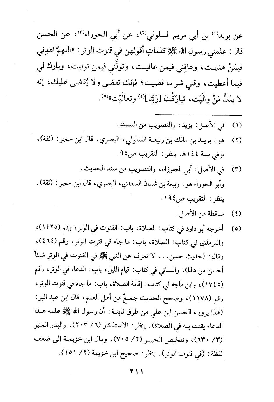 عن بريد (¬1) بن أبي مريم السلولي (¬2)، عن أبي الحوراء (¬3)، عن الحسن قال: علمني رسول الله - صلى الله عليه وسلم - كلماتٍ أقولهن في قنوت الوتر: "اللهمَّ اهدِني فيمَنْ هديت، وعافِني فيمن عافيت، وتولَّني فيمن توليت، وبارك لي فيما أعطيت، وقني شر ما قضيت؛ فإنك تقضي ولا يُقضى عليك، إنه لا يذلُّ مَنْ والَيْت، تبارَكْتَ [رَبَّنا] (¬4) وتعالَيْت" (¬5).