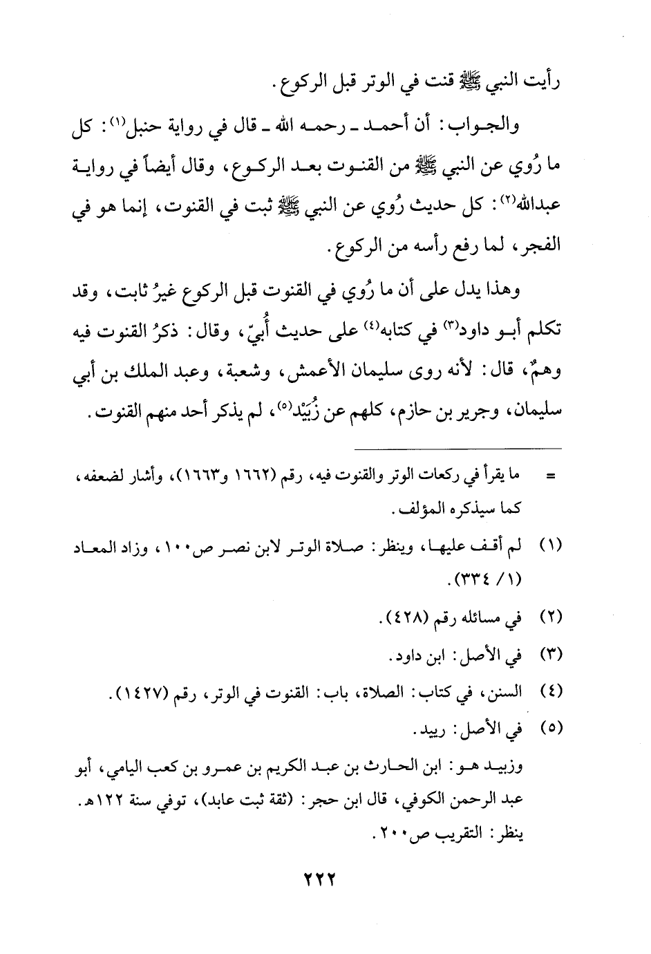 وهذا يدل على أن ما رُوي في القنوت قبل الركوع غيرُ ثابت، وقد تكلم أبو داود (¬3) في كتابه (¬4) على حديث أُبيّ، وقال: ذكرُ القنوت فيه وهمٌ، قال: لأنه روى سليمان الأعمش، وشعبة، وعبد الملك بن أبي سليمان، وجرير بن حازم، كلهم عن زُبَيْد (¬5)، لم يذكر أحد منهم القنوت.