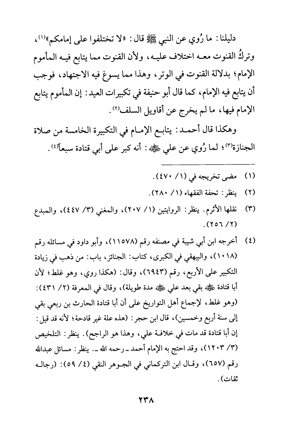 (¬4) أخرجه ابن أبي شيبة في مصنفه رقم (11578)، وأبو داود في مسائله رقم (1018)، والبيهقي في الكبرى، كتاب: الجنائز، باب: من ذهب في زيادة التكبير على الأربع، رقم (6943)، وقال: (هكذا روي، وهو غلط؛ لأن أبا قتادة - رضي الله عنه - بقي بعد علي - رضي الله عنه - مدة طويلة)، وقال في المعرفة (2/ 431): (وهو غلط، لإجماع أهل التواريخ على أن أبا قتادة الحارث بن ربعي بقي إلى سنة أربع وخمسين)، قال ابن حجر: (هذه علة غير قادحة؛ لأنه قد قيل: إن أبا قتادة قد مات في خلافة علي، وهذا هو الراجح). ينظر: التلخيص (3/ 1203)، وقد احتج به الإمام أحمد - رحمه الله -. ينظر: مسائل عبد الله رقم (657)، وقال ابن التركماني في الجوهر النقي (4/ 59): (رجاله ثقات).