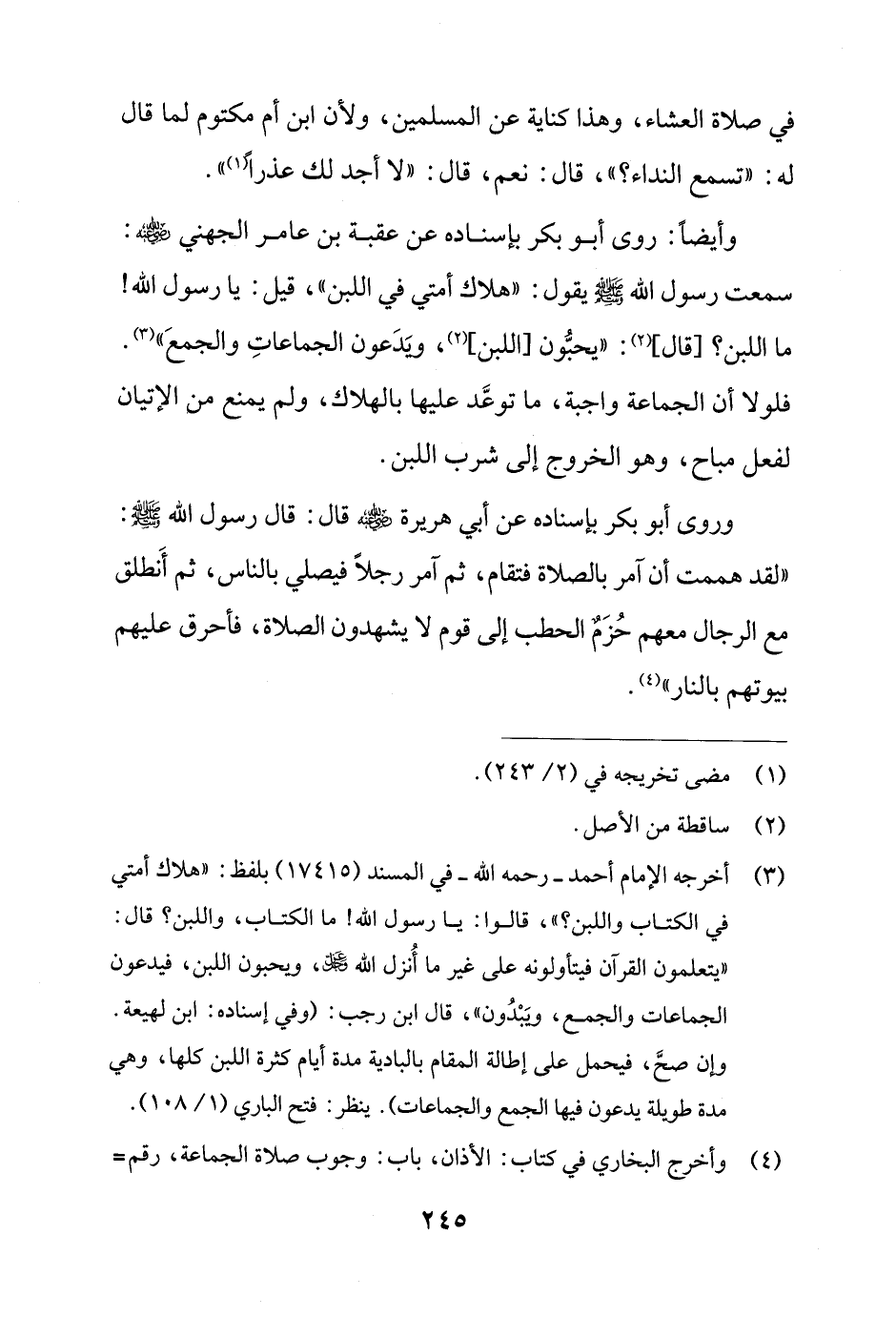 وأيضًا: روى أبو بكر بإسناده عن عقبة بن عامر الجهني - رضي الله عنه -: سمعت رسول الله - صلى الله عليه وسلم - يقول: "هلاك أمتي في اللبن"، قيل: يا رسول الله! ما اللبن؟ [قال] (¬2): "يحبُّون [اللبن] (2)، ويَدَعون الجماعاتِ والجمعَ" (¬3). فلولا أن الجماعة واجبة، ما توعَّد عليها بالهلاك، ولم يمنع مني الإتيان لفعل مباح، وهو الخروج إلى شرب اللبن.