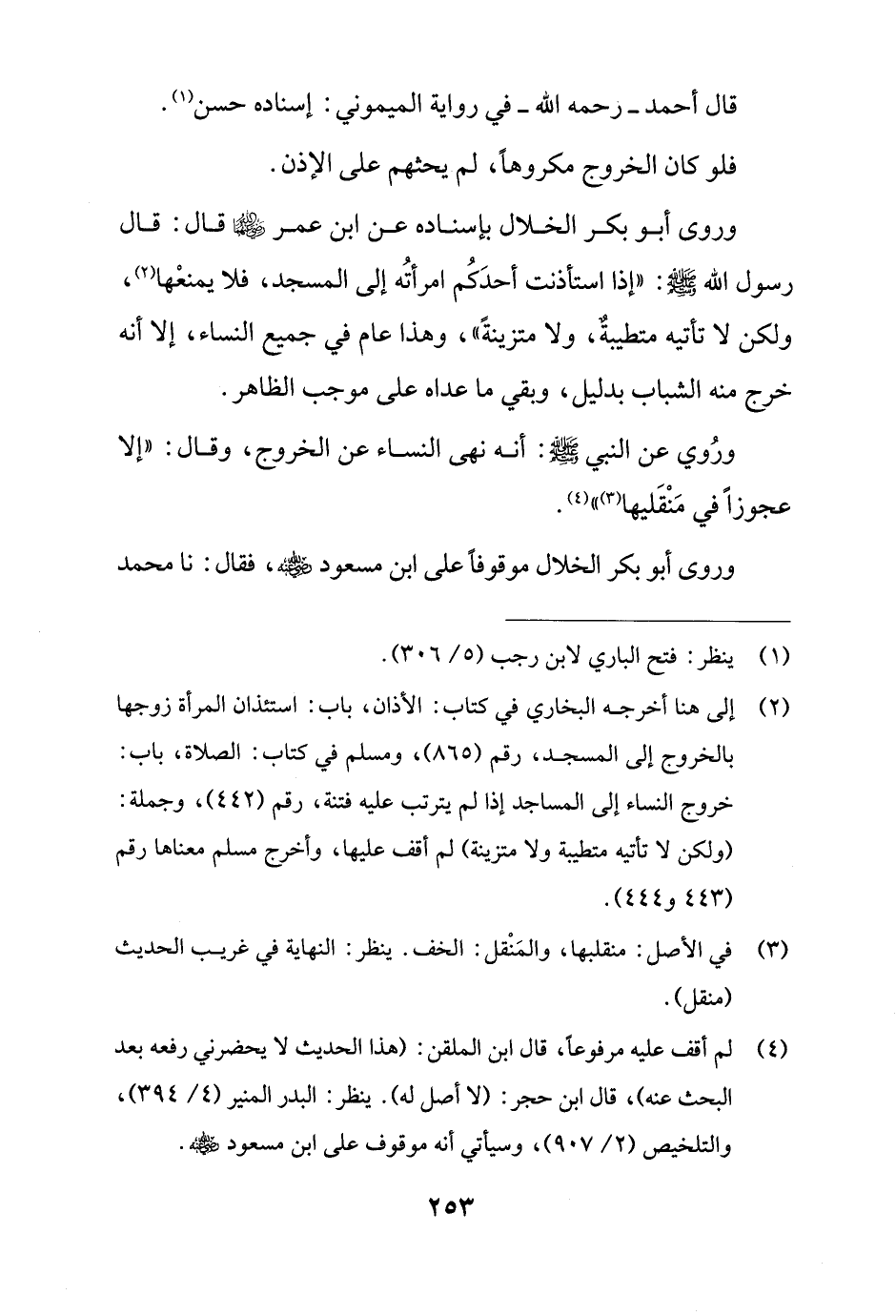 وروى أبو بكر الخلال بإسناده عن ابن عمر - رضي الله عنهما - قال: قال رسول الله - صلى الله عليه وسلم -: "إذا استأذنت أحدَكُم امرأتُه إلى المسجد، فلا يمنعْها (¬2)، ولكن لا تأتيه متطيبةٌ، ولا متزينةً"، وهذا عام في جميع النساء، إلا أنه خرج منه الشباب بدليل، وبقي ما عداه على موجب الظاهر.