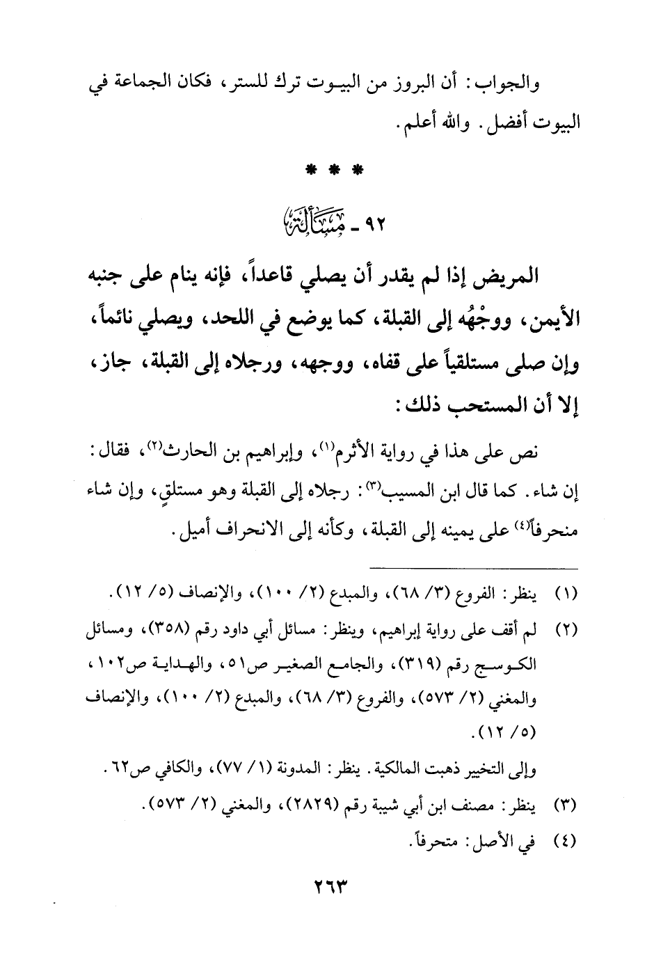 92 - مَسْألَة: المريض إذا لم يقدر أن يصلي قاعدًا، فإنه ينام على جنبه الأيمن، ووجْهُه إلى القبلة، كما يوضع في اللحد، ويصلي نائمًا، وإن صلى مستلقيًا على قفاه، ووجهه، ورجلاه إلى القبلة، جاز، إلا أن المستحب ذلك: