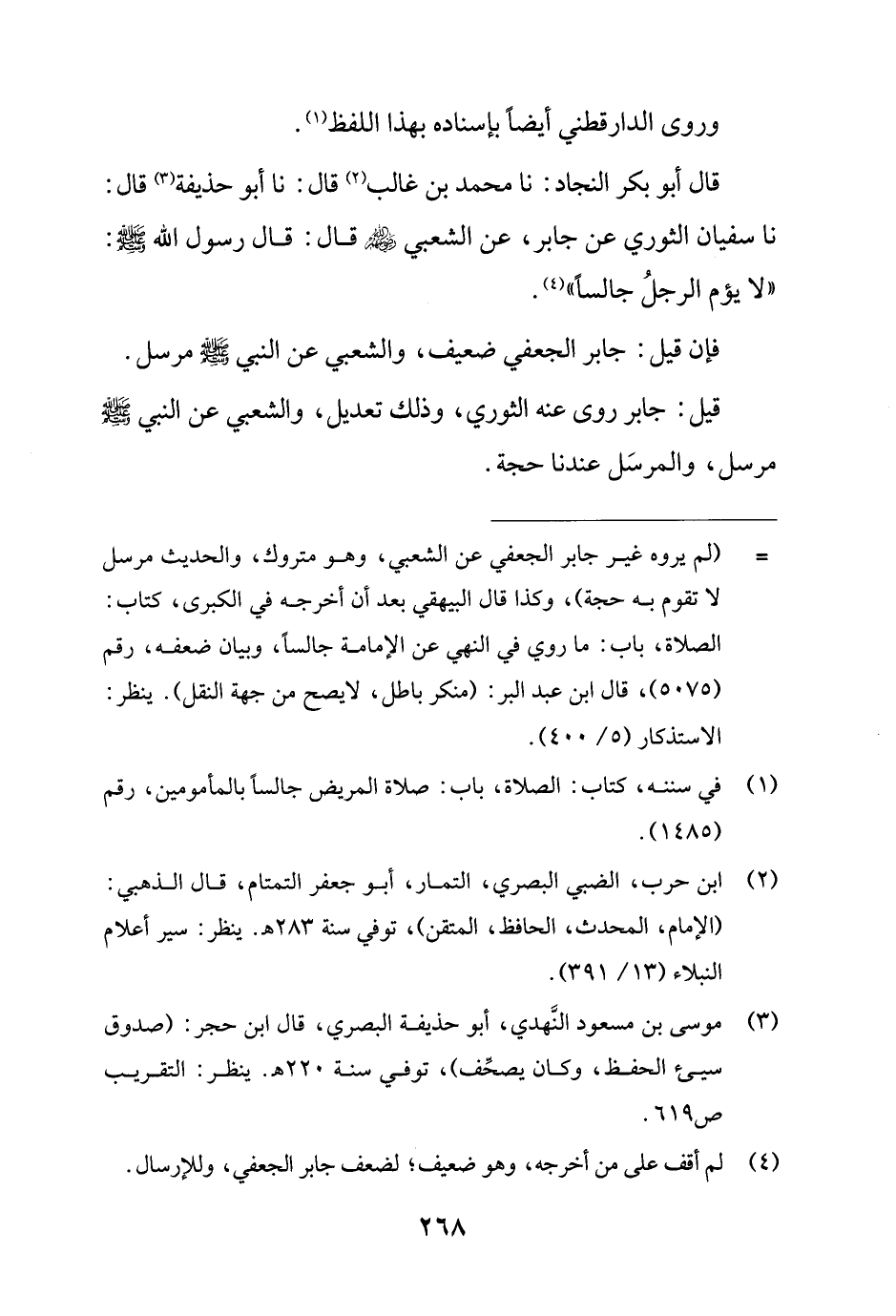 قال أبو بكر النجاد: نا محمد بن غالب (¬2) قال: نا أبو حذيفة (¬3) قال: نا سفيان الثوري عن جابر، عن الشعبي - رضي الله عنهم - قال: قال رسول الله - صلى الله عليه وسلم - "لا يؤم الرجلُ جالسًا" (¬4).
