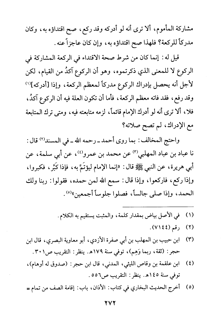 واحتج المخالف: بما روى أحمد - رحمه الله - في المسند (¬2) قال: نا عباد بن عباد المهلبي (¬3) عن محمد بن عمرو (¬4)، عن أبي سلمة، عن أبي هريرة، عن النبي - صلى الله عليه وسلم - قال: "إنما الإمام ليؤتَمَّ به، فإذا كَبَّر، فكبروا، وإذا ركع، فاركعوا، وإذا قال: سمع الله لمن حمده، فقولوا: ربنا ولك الحمد، وإذا صلى جالسًا، فصلوا جلوسًا أجمعين" (¬5).