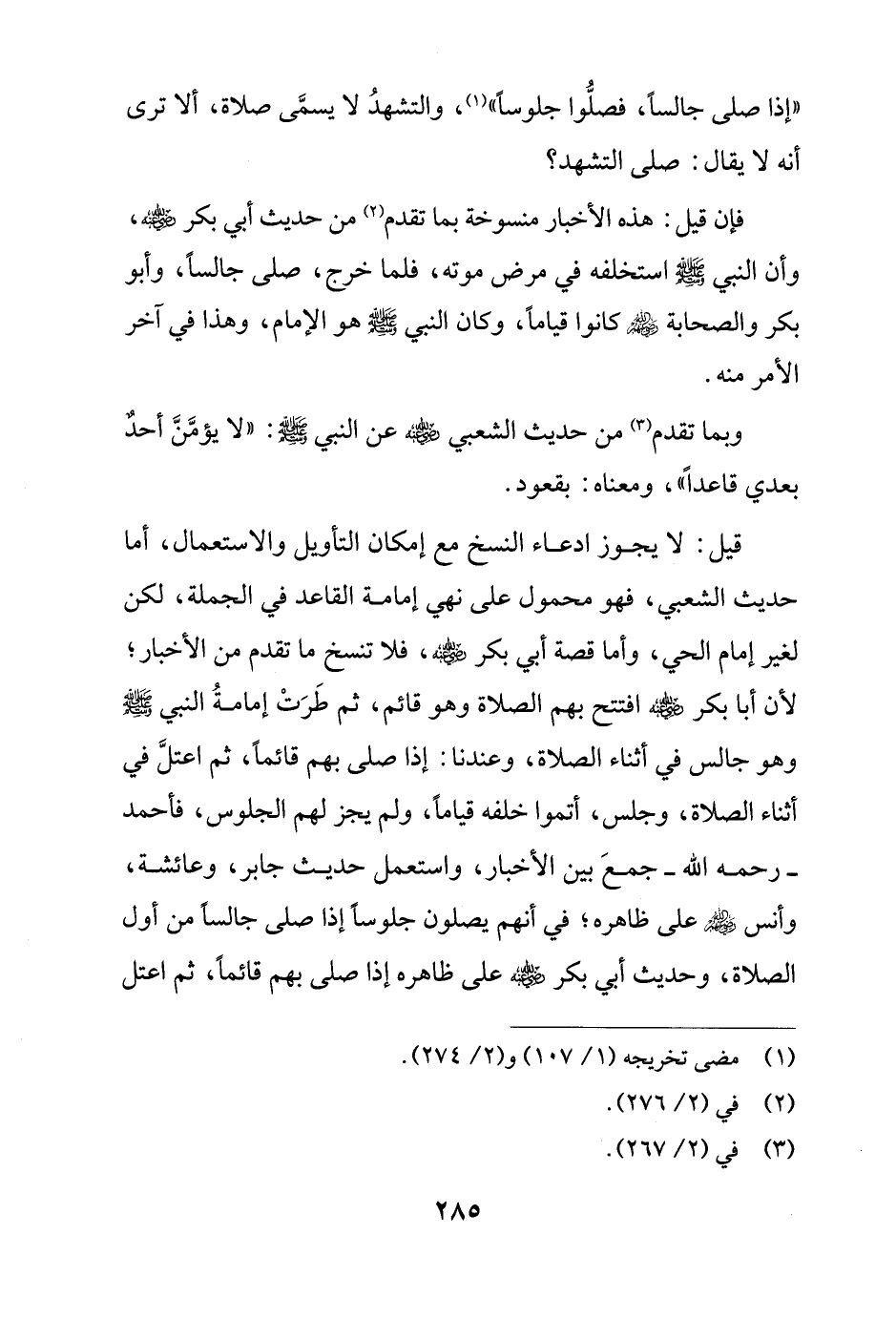 قيل: لا يجوز ادعاء النسخ مع إمكان التأويل والاستعمال، أما حديث الشعبي، فهو محمول على نهي إمامة القاعد في الجملة، لكن لغير إمام الحي، وأما قصة أبي بكر - رضي الله عنه -، فلا تنسخ ما تقدم من الأخبار؛ لأن أبا بكر - رضي الله عنه - افتتح بهم الصلاة وهو قائم، ثم طَرَتْ إمامةُ النبي - صلى الله عليه وسلم - وهو جالس في أثناء الصلاة، وعندنا: إذا صلى بهم قائمًا، ثم اعتلَّ في أثناء الصلاة، وجلس، أتموا خلفه قيامًا، ولم يجز لهم الجلوس، فأحمد - رحمه الله - جمعَ بين الأخبار، واستعمل حديث جابر، وعائشة، وأنس - رضي الله عنهم - على ظاهره، في أنهم يصلون جلوسًا إذا صلى جالسًا من أول الصلاة، وحديث أبي بكر - رضي الله عنه - على ظاهره إذا صلى بهم قائمًا، ثم اعتل