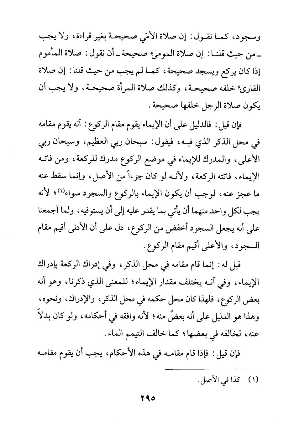 وسجود، كما نقول: إن صلاة الأمّي صحيحة بغير قراءة، ولا يجب - من حيث قلنا: إن صلاة المومئ صحيحة - أن نقول: صلاة المأموم إذا كان يركع ويسجد صحيحة، كما لم يجب من حيث قلنا: إن صلاة القارئ خلفه صحيحة، وكذلك صلاة المرأة صحيحة، ولا يجب أن يكون صلاة الرجل خلفها صحيحة.