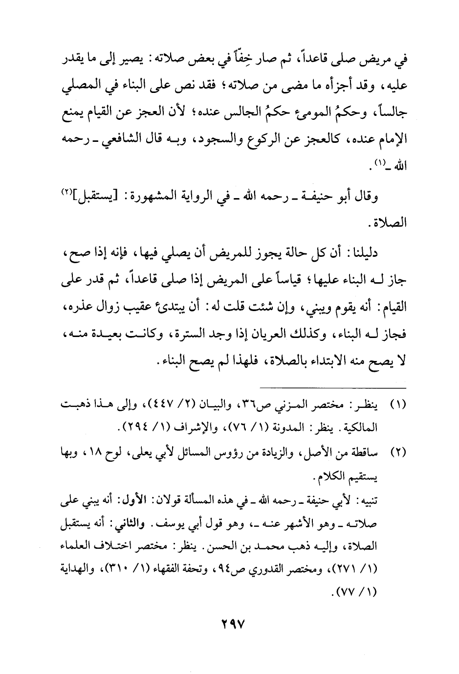 تنبيه: لأبي حنيفة - رحمه الله - في هذه المسألة قولان: الأول: أنه يبني على صلاته - وهو الأشهر عنه -، وهو قول أبي يوسف. والثاني: أنه يستقبل الصلاة، وإليه ذهب محمد بن الحسن. ينظر: مختصر اختلاف العلماء (1/ 271)، ومختصر القدوري ص 94، وتحفة الفقهاء (1/ 310)، والهداية (1/ 77).