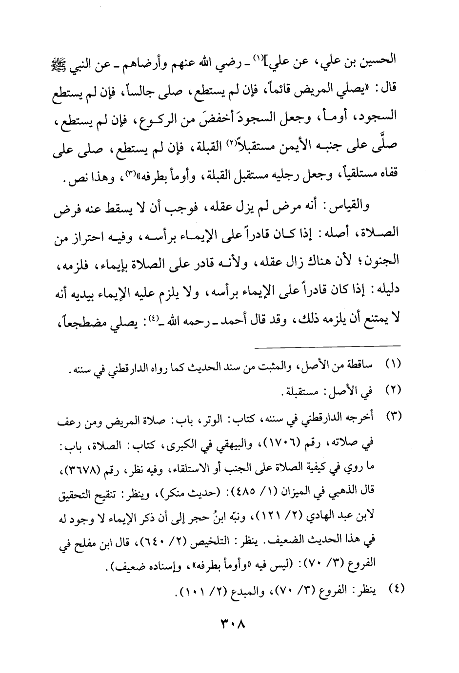 (¬3) أخرجه الدارقطني في سننه، كتاب: الوتر، باب: صلاة المريض ومن رعف في صلاته، رقم (1706)، والبيهقي في الكبرى، كتاب: الصلاة، باب: ما روي في كيفية الصلاة على الجنب أو الاستلقاء، وفيه نظر، رقم (3678)، قال الذهبي في الميزان (1/ 485): (حديث منكر)، وينظر: تنقيح التحقيق لابن عبد الهادي (2/ 121)، ونبّه ابنُ حجر إلى أن ذكر الإيماء لا وجود له في هذا الحديث الضعيف. ينظر: التلخيص (2/ 640)، قال ابن مفلح في الفروع (3/ 70): (ليس فيه "وأومأ بطرفه"، وإسناده ضعيف).