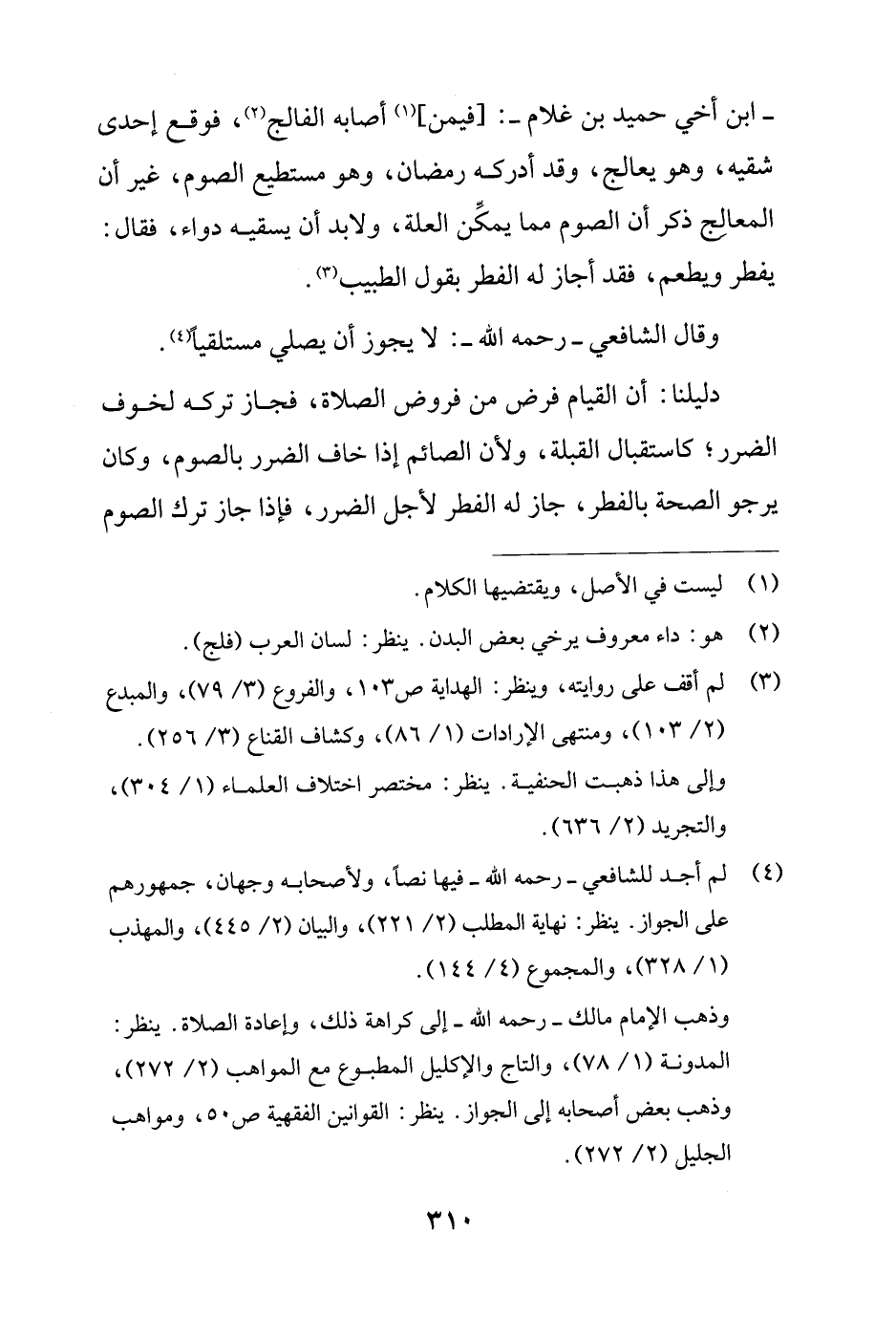- ابن أخي حميد بن غلام -: [فيمن] (¬1) أصابه الفالج (¬2)، فوقع إحدى شقيه، وهو يعالج، وقد أدركه رمضان، وهو مستطيع الصوم، غير أن المعالِج ذكر أن الصوم مما يمكِّن العلة، ولا بد أن يسقيه دواء، فقال: يفطر ويطعم، فقد أجاز له الفطر بقول الطبيب (¬3).