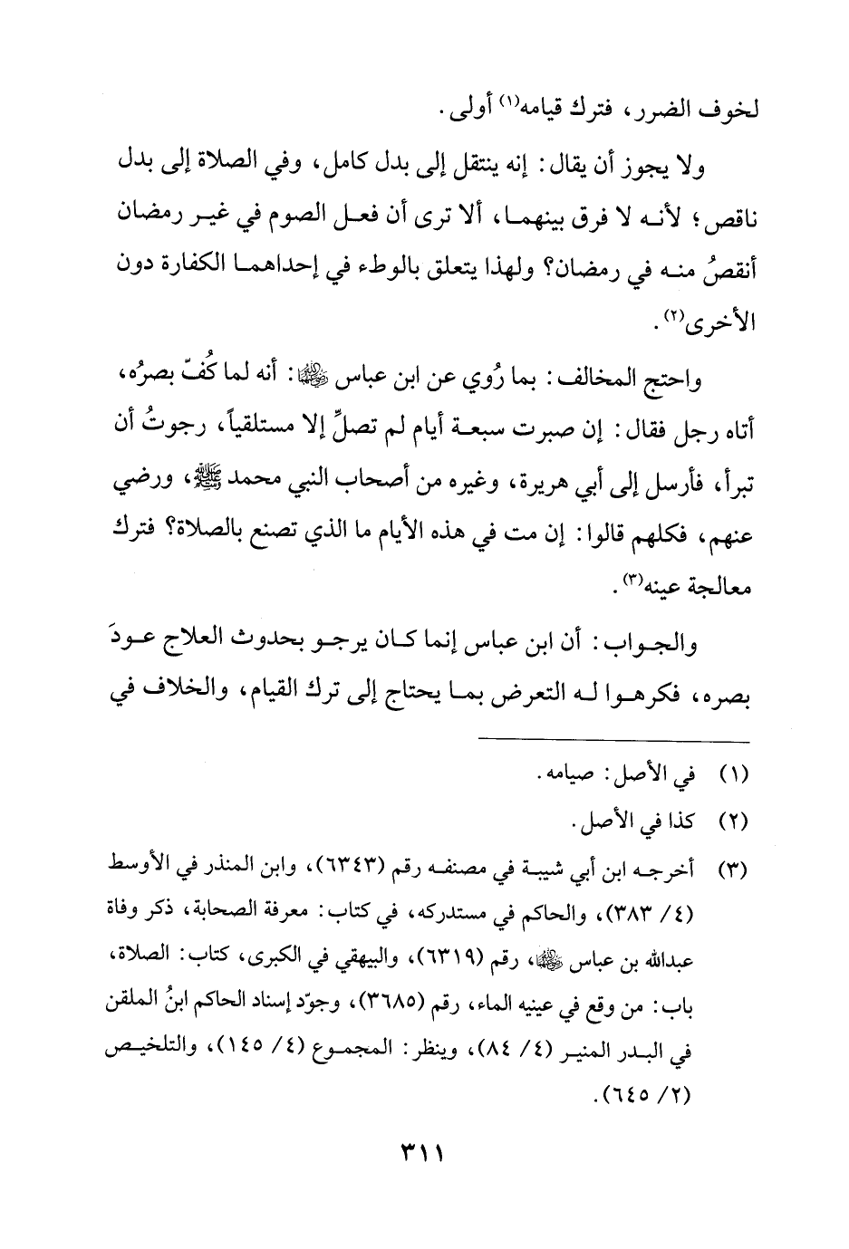 (¬3) أخرجه ابن أبي شيبة في مصنفه رقم (6343)، وابن المنذر في الأوسط (4/ 383)، والحاكم في مستدركه، في كتاب: معرفة الصحابة، ذكر وفاة عبد الله بن عباس - رضي الله عنهما -، رقم (6319)، والبيهقي في الكبرى، كتاب: الصلاة، باب: من وقع في عينيه الماء، رقم (3685)، وجوّد إسناد الحاكم ابنُ الملقن في البدر المنير (4/ 84)، وينظر: المجموع (4/ 145)، والتلخيص (2/ 645).