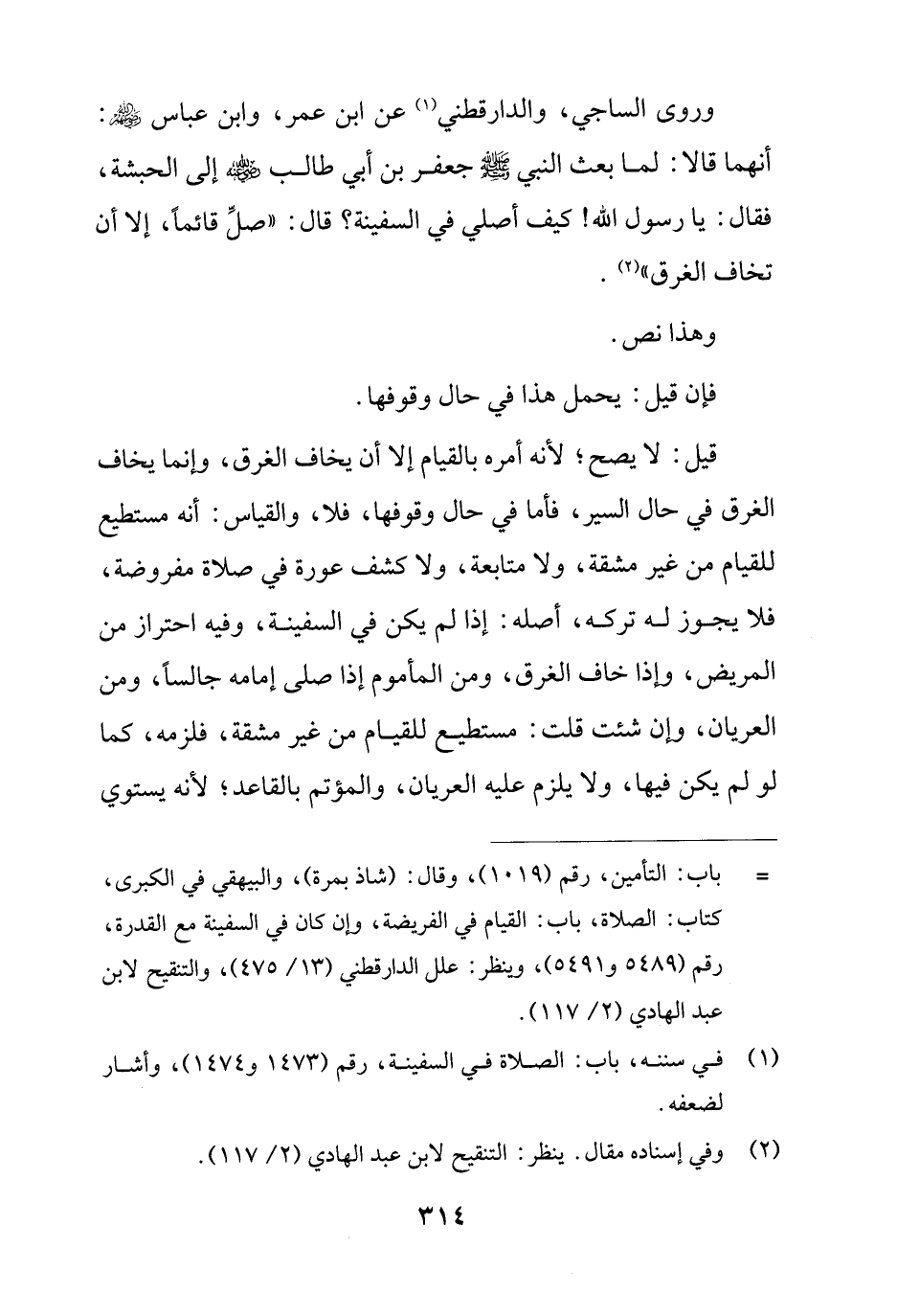 وروى الساجي، والدارقطني (¬1) عن ابن عمر، وابن عباس - رضي الله عنهم -: أنهما قالا: لما بعث النبي - صلى الله عليه وسلم - جعفر بن أبي طالب - رضي الله عنه - إلى الحبشة، فقال: يا رسول الله! كيف أصلي في السفينة؟ قال: "صلِّ قائمًا، إلا أن تخاف الغرق" (¬2).