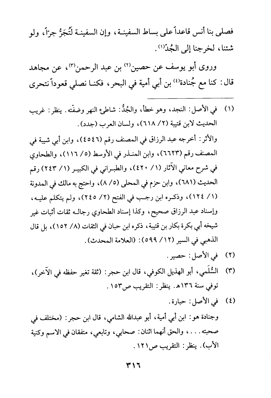 فصلى بنا أنس قاعدًا على بساط السفينة، وإن السفينة لَتُجَرُّ جرًّا، ولو شئنا، لخرجنا إلى الجُدّ (¬1).
