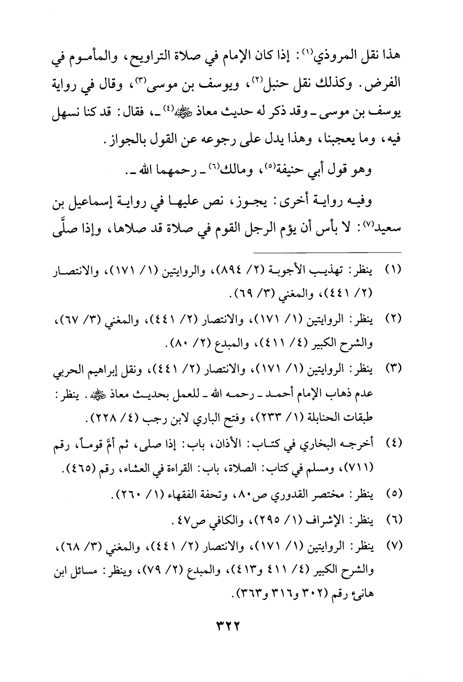 (¬3) ينظر: الروايتين (1/ 171)، والانتصار (2/ 441)، ونقل إبراهيم الحربي عدم ذهاب الإمام أحمد - رحمه الله - للعمل بحديث معاذ - رضي الله عنه -. ينظر: طبقات الحنابلة (1/ 233)، وفتح الباري لابن رجب (4/ 228).