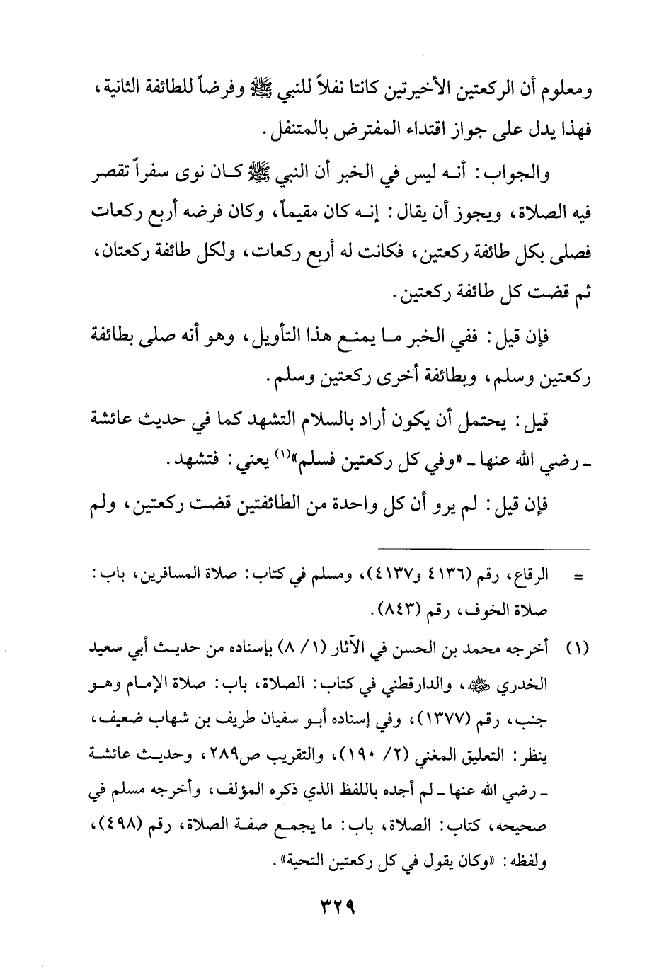 ومعلوم أن الركعتين الأخيرتين كانتا نفلًا للنبي - صلى الله عليه وسلم - وفرضًا للطائفة الثانية، فهذا يدل على جواز اقتداء المفترض بالمتنفل.