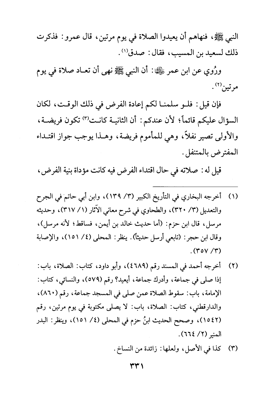 ورُوي عن ابن عمر - رضي الله عنهما -: أن النبي - صلى الله عليه وسلم - نهى أن تعاد صلاة في يوم مرتين (¬2).