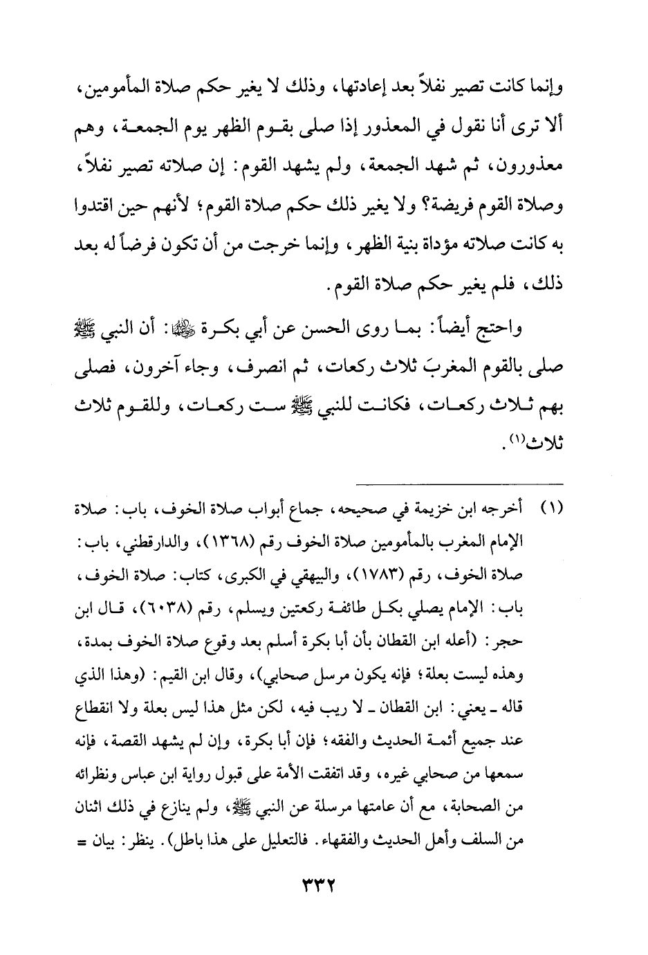 (¬1) أخرجه ابن خزيمة في صحيحه, جماع أبواب صلاة الخوف، باب: صلاة الإمام المغرب بالمأمومين صلاة الخوف رقم (1368)، والدارقطني، باب: صلاة الخوف، رقم (1783)، والبيهقي في الكبرى, كتاب: صلاة الخوف، باب: الإمام يصلي بكل طائفة ركعتين ويسلم، رقم (6038)، قال ابن حجر: (أعله ابن القطان بأن أبا بكرة أسلم بعد وقوع صلاة الخوف بمدة، وهذه ليست بعلة؛ فإنه يكون مرسل صحابي)، وقال ابن القيم: (وهذا الذي قاله - يعني: ابن القطان - لا ريب فيه، لكن مثل هذا ليس بعلة ولا انقطاع عند جميع أئمة الحديث والفقه؛ فإن أبا بكرة، وإن لم يشهد القصة، فإنه سمعها من صحابي غيره، وقد اتفقت الأمة على قبول رواية ابن عباس ونظرائه من الصحابة، مع أن عامتها مرسلة عن النبي - صلى الله عليه وسلم -، ولم ينازع في ذلك اثنان من السلف وأهل الحديث والفقهاء. فالتعليل على هذا باطل). ينظر: بيان =