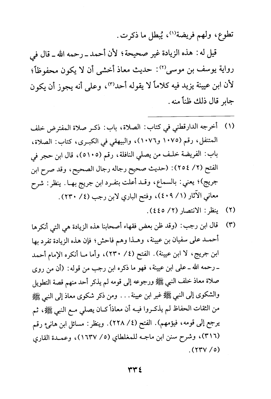 (¬3) قال ابن رجب: (وقد ظن بعض فقهاء أصحابنا هذه الزيادة هي التي أنكرها أحمد على سفيان بن عيينة، وهذا وهم فاحش؛ فإن هذه الزيادة تفرد بها ابن جريج، لا ابن عيينة). الفتح (4/ 230)، وأما ما أنكره الإمام أحمد - رحمه الله - على ابن عيينة، فهو ما ذكره ابن رجب من قوله: (أن من روى صلاة معاذ خلف النبي - صلى الله عليه وسلم - ورجوعه إلى قومه لم يذكر أحد منهم قصة التطويل والشكوى إلى النبي - صلى الله عليه وسلم - غير ابن عيينة ... ومن ذكر شكوى معاذ إلى النبي - صلى الله عليه وسلم - من الثقات الحفاظ لم يذكروا فيه أن معاذًا كان يصلي مع النبي - صلى الله عليه وسلم -، ثم يرجع إلى قومه، فيؤمهم). الفتح (4/ 228). وينظر: مسائل ابن هانئ رقم (316)، وشرح سنن ابن ماجه للمغلطاي (5/ 1637)، وعمدة القاري (5/ 237).