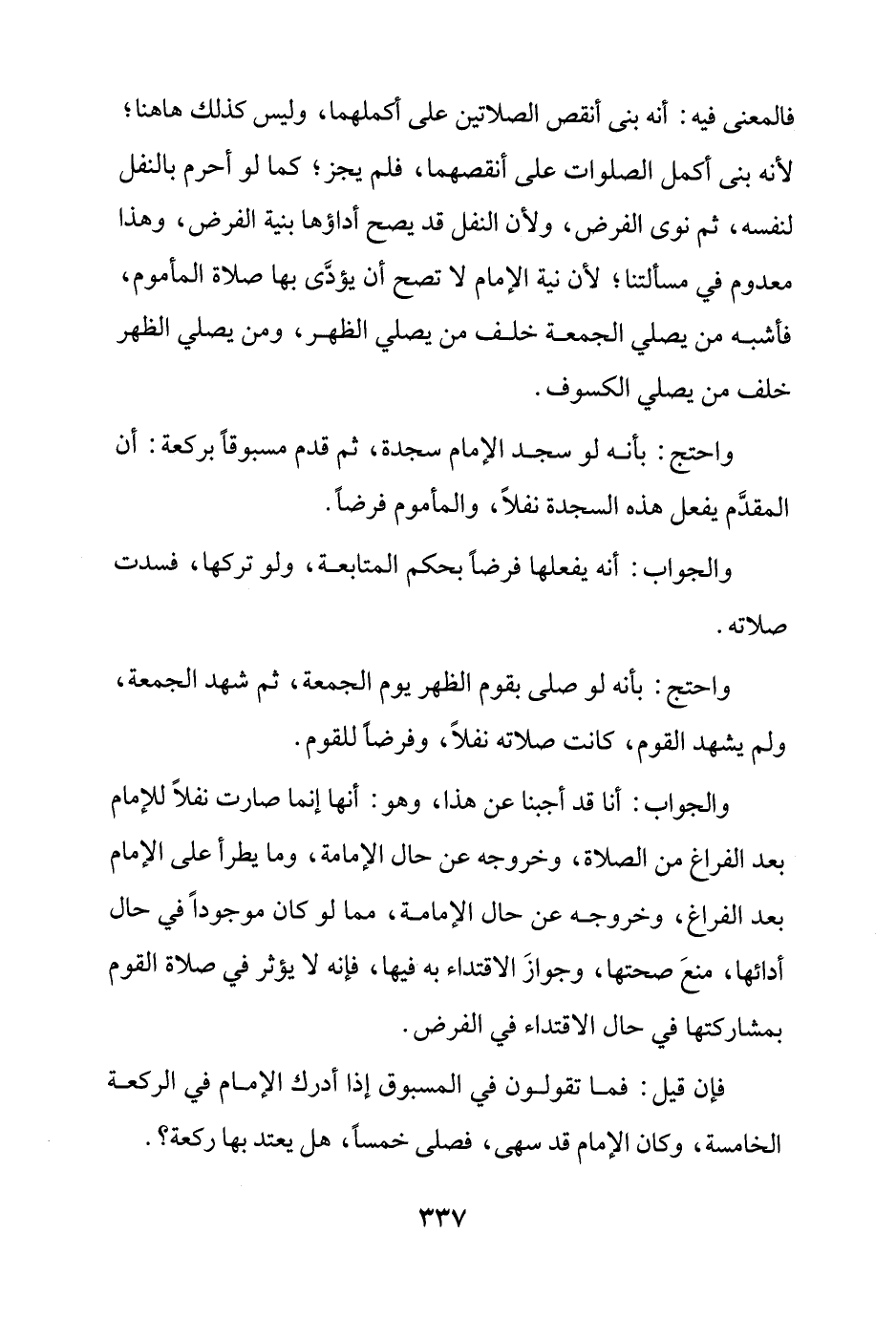 والجواب: أنا قد أجبنا عن هذا، وهو: أنها إنما صارت نفلًا للإمام بعد الفراغ من الصلاة، وخروجه عن حال الإمامة، وما يطرأ على الإمام بعد الفراغ، وخروجه عن حال الإمامة، مما لو كان موجودًا في حال أدائها، منعَ صحتها، وجوازَ الاقتداء به فيها، فإنه لا يؤثر في صلاة القوم بمشاركتها في حال الاقتداء في الفرض.