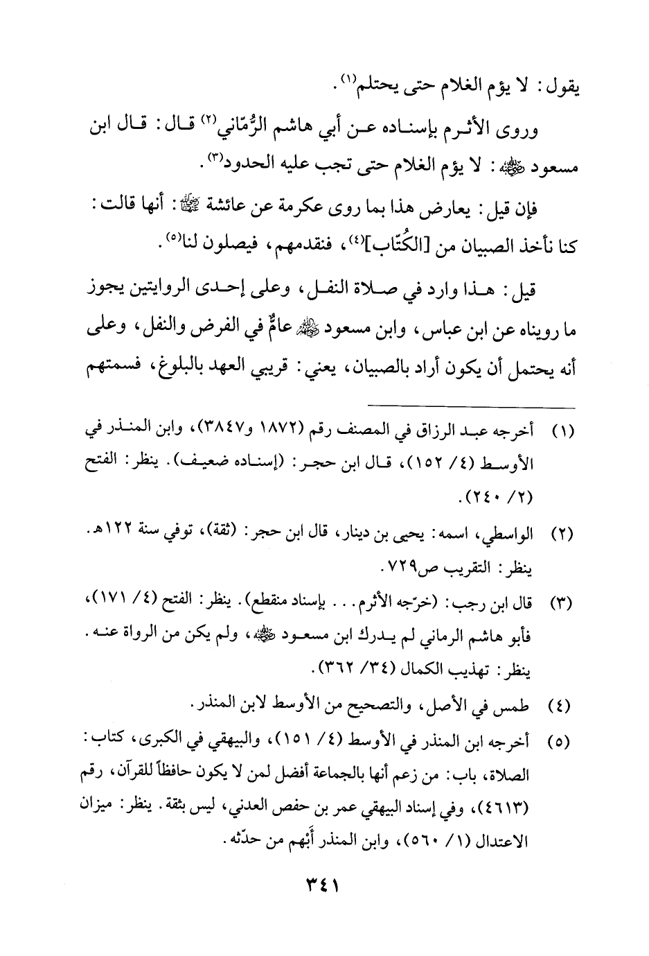 (¬3) قال ابن رجب: (خرّجه الأثرم ... بإسناد منقطع). ينظر: الفتح (4/ 171)، فأبو هاشم الرماني لم يدرك ابن مسعود - رضي الله عنه -، ولم يكن من الرواة عنه. ينظر: تهذيب الكمال (34/ 362).