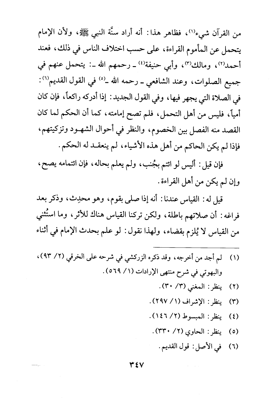 من القرآن شيء (¬1)، فظاهر هذا: أنه أراد سنَّة النبي - صلى الله عليه وسلم -، ولأن الإمام يتحمل عن المأموم القراءة، على حسب اختلاف الناس في ذلك، فعند أحمد (¬2)، ومالك (¬3)، وأبي حنيفة (¬4) - رحمهم الله -: يتحمل عنهم في جميع الصلوات، وعند الشافعي - رحمه الله - (¬5) في القول القديم (¬6): في الصلاة التي يجهر فيها، وفي القول الجديد: إذا أدركه راكعًا، فإن كان أميًا، فليس من أهل التحمل، فلم تصح إمامته، كما أن الحكم لما كان القصد منه الفصل بين الخصوم، والنظر في أحوال الشهود وتزكيتهم، فإذا لم يكن الحاكم من أهل هذه الأشياء، لم ينعقد له الحكم.