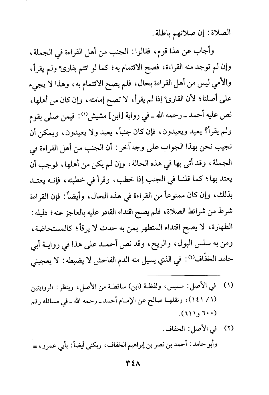 وأجاب عن هذا قوم، فقالوا: الجنب من أهل القراءة في الجملة، وإن لم توجد منه القراءة، فصح الائتمام به؛ كما لو ائتم بقارئ ولم يقرأ، والأمي ليس من أهل القراءة بحال، فلم يصح الائتمام به، وهذا لا يجيء على أصلنا؛ لأن القارئ إذا لم يقرأ، لا تصح إمامته، وإن كان من أهلها، نص عليه أحمد - رحمه الله - في رواية [ابن] مشيش (¬1): فيمن صلى بقوم ولم يقرأ؟ يعيد ويعيدون، فإن كان جنبًا، يعيد ولا يعيدون، ويمكن أن نجيب نحن بهذا الجواب على وجه آخر: أن الجنب من أهل القراءة في الجملة، وقد أتى بها في هذه الحالة، وإن لم يكن من أهلها، فوجب أن يعتد بها؛ كما قلنا في الجنب إذا خطب، وقرأ في خطبته، فإنه يعتد بذلك، وإن كان ممنوعًا من القراءة في هذه الحال، وأيضًا: فإن القراءة شرط من شرائط الصلاة، فلم يصح اقتداء القادر عليه بالعاجز عنه؛ دليله: الطهارة، لا يصح اقتداء المتطهر بمن به حدث لا يرقأ؛ كالمستحاضة، ومن به سلس البول، والريح، وقد نص أحمد على هذا في رواية أبي حامد الخفّاف (¬2): في الذي يسيل منه الدم الفاحش لا يضبطه: لا يعجبني
