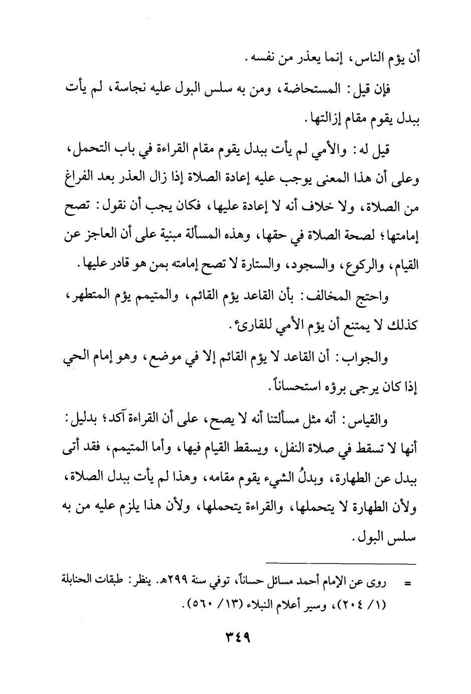 قيل له: والأمي لم يأت ببدل يقوم مقام القراءة في باب التحمل، وعلى أن هذا المعنى يوجب عليه إعادة الصلاة إذا زال العذر بعد الفراغ من الصلاة، ولا خلاف أنه لا إعادة عليها، فكان يجب أن نقول: تصح إمامتها؛ لصحة الصلاة في حقها، وهذه المسألة مبنية على أن العاجز عن القيام، والركوع، والسجود، والستارة لا تصح إمامته بمن هو قادر عليها.