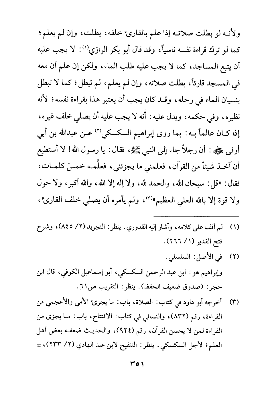 ولأنه لو بطلت صلاته إذا علم بالقارئ خلفه، بطلت، وإن لم يعلم؛ كما لو ترك قراءة نفسه ناسيًا، وقد قال أبو بكر الرازي (¬1): لا يجب عليه أن يتبع المساجد، كما لا يجب عليه طلب الماء، ولكن إن علم أن معه في المسجد قارئًا، بطلت صلاته، وإن لم يعلم، لم تبطل؛ كما لا تبطل بنسيان الماء في رحله، وقد كان يجب أن يعتبر هذا بقراءة نفسه؛ لأنه نظيره، وفي حكمه، ويدل عليه: أنه لا يجب عليه أن يصلي خلف غيره، إذا كان عالمًا به: بما روى إبراهيم السكسكي (¬2) عن عبد الله بن أبي أوفى - رضي الله عنه -: أن رجلًا جاء إلى النبي - صلى الله عليه وسلم -، فقال: يا رسول الله! لا أستطيع أن آخذ شيئًا من القرآن، فعلمني ما يجزئني، فعلَّمه خمسَ كلمات، فقال: "قل: سبحان الله، والحمد لله، ولا إله إلا الله، والله أكبر، ولا حول ولا قوة إلا بالله العلي العظيم" (¬3)، ولم يأمره أن يصلي خلف القارئ،