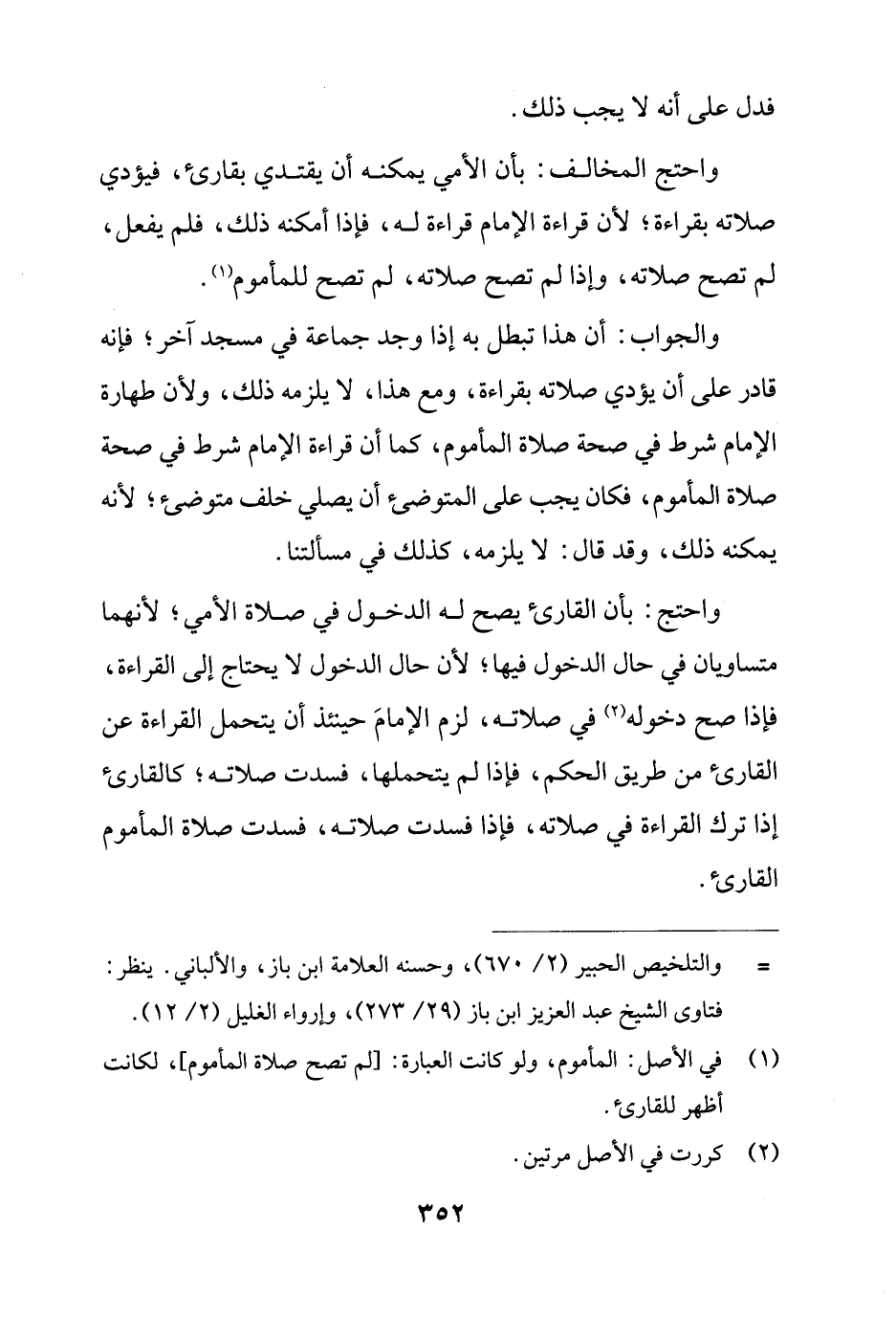 والجواب: أن هذا تبطل به إذا وجد جماعة في مسجد آخر؛ فإنه قادر على أن يؤدي صلاته بقراءة، ومع هذا، لا يلزمه ذلك، ولأن طهارة الإمام شرط في صحة صلاة المأموم، كما أن قراءة الإمام شرط في صحة صلاة المأموم، فكان يجب على المتوضئ أن يصلي خلف متوضئ؛ لأنه يمكنه ذلك، وقد قال: لا يلزمه، كذلك في مسألتنا.