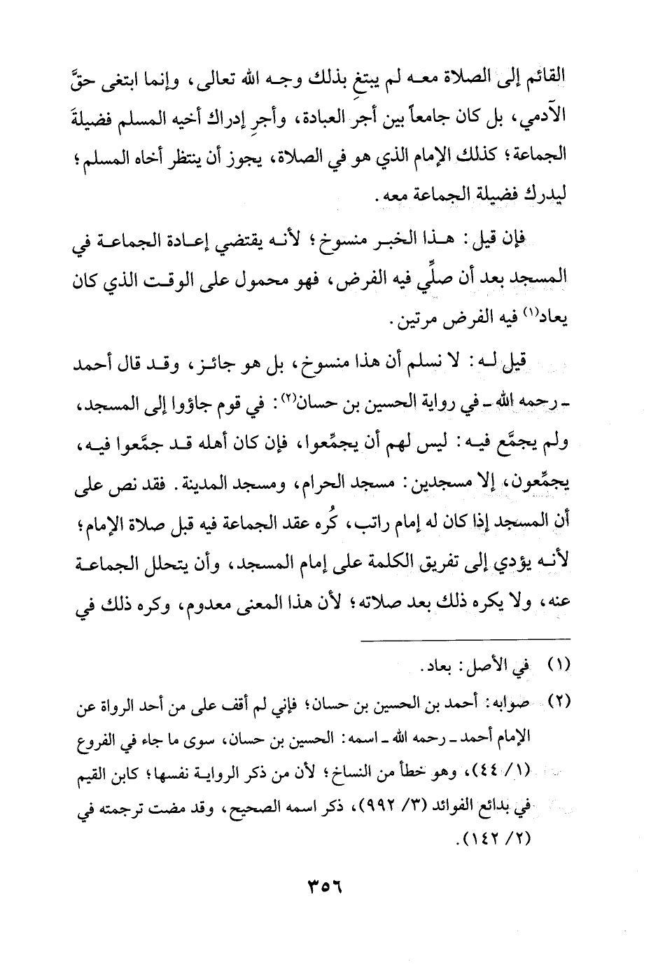 قيل له: لا نسلم أن هذا منسوخ، بل هو جائز، وقد قال أحمد - رحمه الله - في رواية الحسين بن حسان (¬2): في قوم جاؤوا إلى المسجد، ولم يجمَّع فيه: ليس لهم أن يجمِّعوا، فإن كان أهله قد جمَّعوا فيه، يجمِّعون، إلا مسجدين: مسجد الحرام، ومسجد المدينة. فقد نص على أن المسجد إذا كان له إمام راتب، كُره عقد الجماعة فيه قبل صلاة الإمام؛ لأنه يؤدي إلى تفريق الكلمة على إمام المسجد، وأن يتحلل الجماعة عنه، ولا يكره ذلك بعد صلاته؛ لأن هذا المعنى معدوم، وكره ذلك في