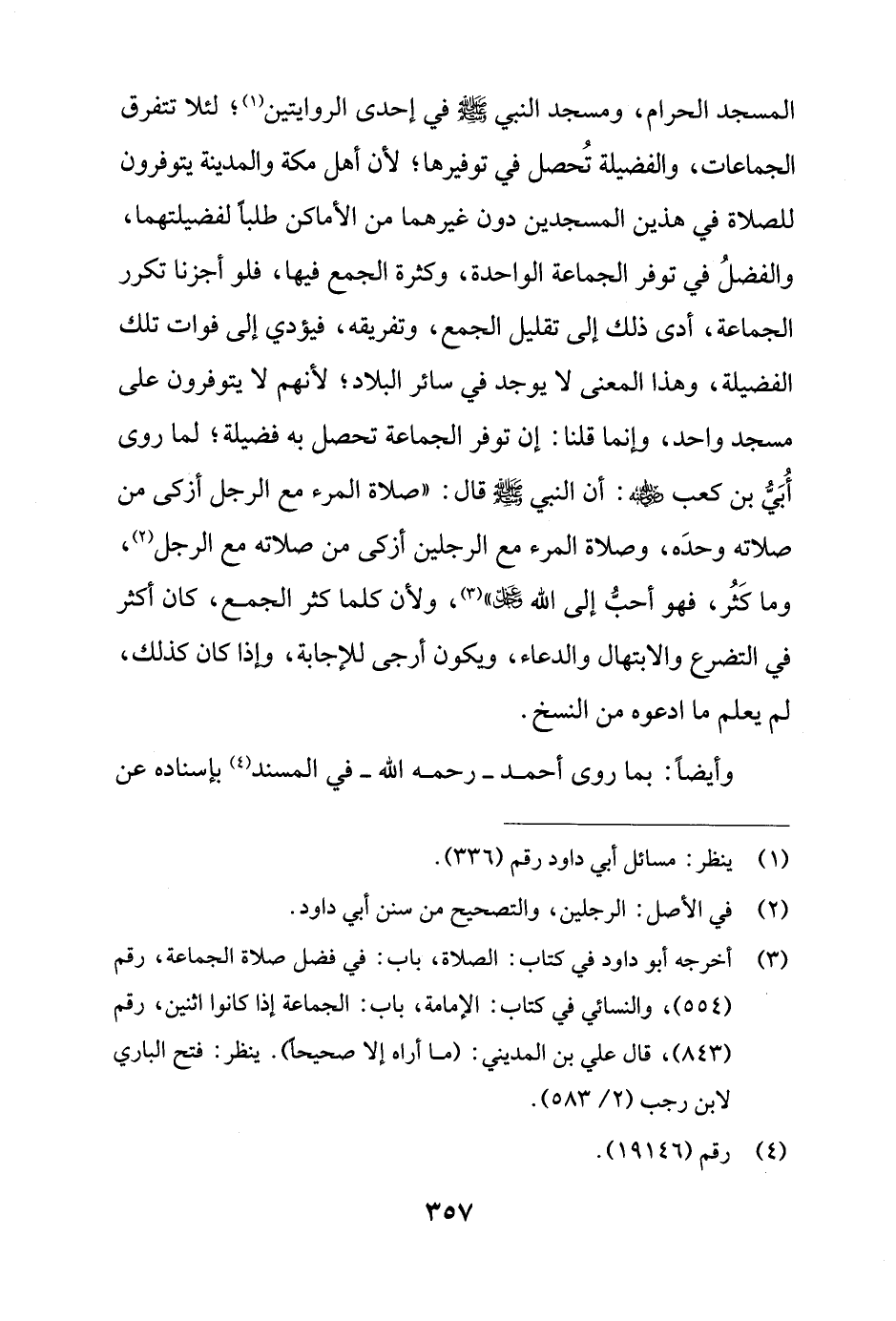المسجد الحرام، ومسجد النبي - صلى الله عليه وسلم - في إحدى الروايتين (¬1)؛ لئلا تتفرق الجماعات، والفضيلة تُحصل في توفيرها؛ لأن أهل مكة والمدينة يتوفرون للصلاة في هذين المسجدين دون غيرهما من الأماكن طلبًا لفضيلتهما، والفضلُ في توفر الجماعة الواحدة، وكثرة الجمع فيها، فلو أجزنا تكرر الجماعة، أدى ذلك إلى تقليل الجمع، وتفريقه، فيؤدي إلى فوات تلك الفضيلة، وهذا المعنى لا يوجد في سائر البلاد؛ لأنهم لا يتوفرون على مسجد واحد، وإنما قلنا: إن توفر الجماعة تحصل به فضيلة؛ لما روى أُبَيُّ بن كعب - رضي الله عنه -: أن النبي - صلى الله عليه وسلم - قال: "صلاة المرء مع الرجل أزكى من صلاته وحدَه، وصلاة المرء مع الرجلين أزكى من صلاته مع الرجل (¬2)، وما كَثُر، فهو أحبُّ إلى الله - عز وجل -" (¬3)، ولأن كلما كثر الجمع، كان أكثر في التضرع والابتهال والدعاء، ويكون أرجى للإجابة، وإذا كان كذلك، لم يعلم ما ادعوه من النسخ.