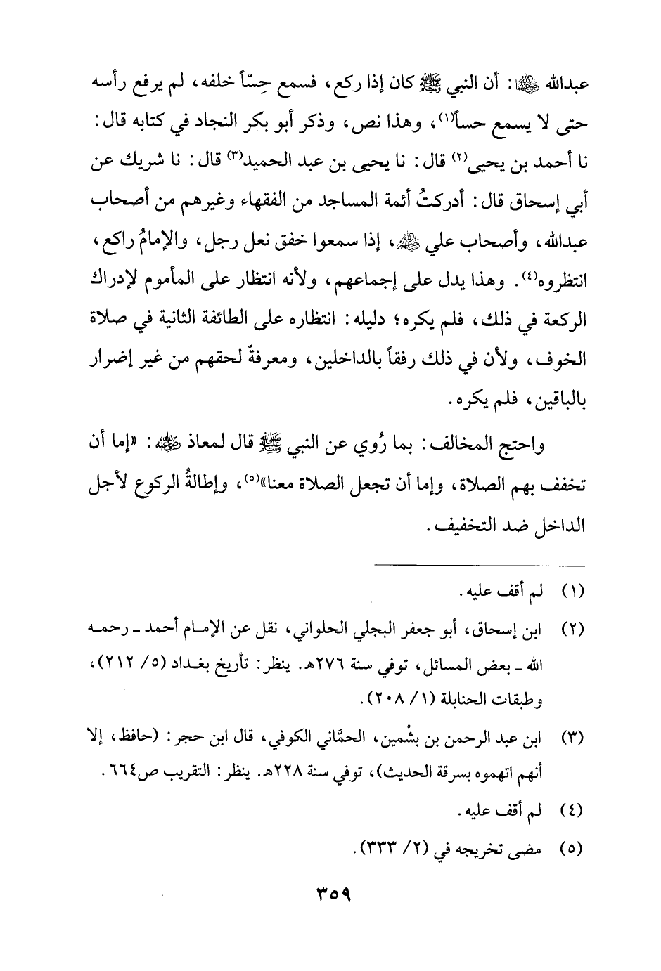 عبد الله - رضي الله عنهما -: أن النبي - صلى الله عليه وسلم - كان إذا ركع، فسمع حِسًّا خلفه، لم يرفع رأسه حتى لا يسمع حسًا (¬1)، وهذا نص، وذكر أبو بكر النجاد في كتابه قال: نا أحمد بن يحيى (¬2) قال: نا يحيى بن عبد الحميد (¬3) قال: نا شريك عن أبي إسحاق قال: أدركتُ أئمة المساجد من الفقهاء وغيرهم من أصحاب عبد الله، وأصحاب علي - رضي الله عنهم -، إذا سمعوا خفق نعل رجل، والإمامُ راكع، انتظروه (¬4). وهذا يدل على إجماعهم، ولأنه انتظار على المأموم لإدراك الركعة في ذلك، فلم يكره؛ دليله: انتظاره على الطائفة الثانية في صلاة الخوف، ولأن في ذلك رفقًا بالداخلين، ومعرفةً لحقهم من غير إضرار بالباقين، فلم يكره.