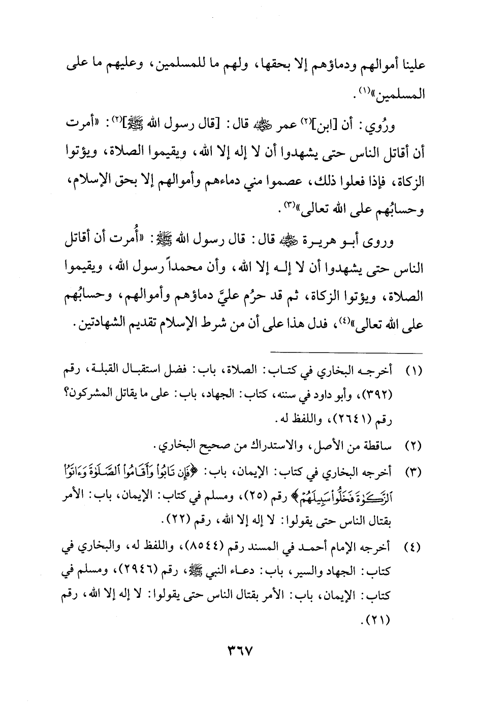 (¬3) أخرجه البخاري في كتاب: الإيمان, باب: {فَإِنْ تَابُوا وَأَقَامُوا الصَّلَاةَ وَآتَوُا الزَّكَاةَ فَخَلُّوا سَبِيلَهُمْ} رقم (25)، ومسلم في كتاب: الإيمان, باب: الأمر بقتال الناس حتى يقولوا: لا إله إلا الله، رقم (22).