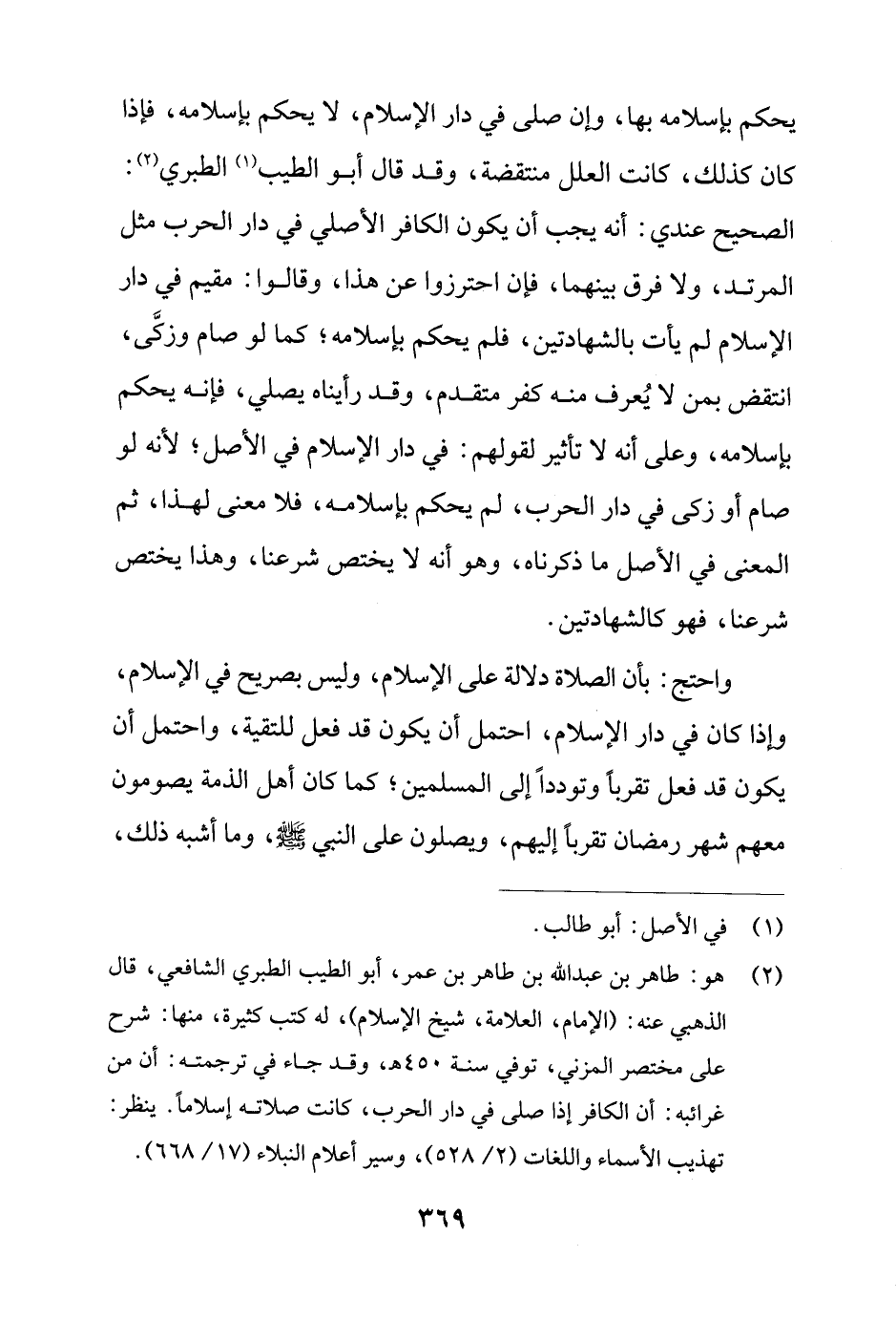 (¬2) هو: طاهر بن عبد الله بن طاهر بن عمر، أبو الطيب الطبري الشافعي، قال الذهبي عنه: (الإمام، العلامة، شيخ الإسلام)، له كتب كثيرة، منها: شرح على مختصر المزني، توفي سنة 450 هـ، وقد جاء في ترجمته: أن من غرائبه: أن الكافر إذا صلى في دار الحرب، كانت صلاته إسلامًا. ينظر: تهذيب الأسماء واللغات (2/ 528)، وسير أعلام النبلاء (17/ 668).