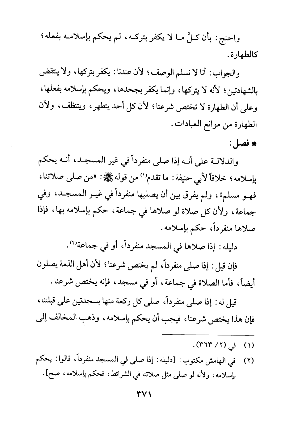 (¬2) في الهامش مكتوب: [دليله: إذا صلى في المسجد منفردًا، قالوا: يحكم بإسلامه، ولأنه لو صلى مثل صلاتنا في الشرائط، فحكم بإسلامه، صح].