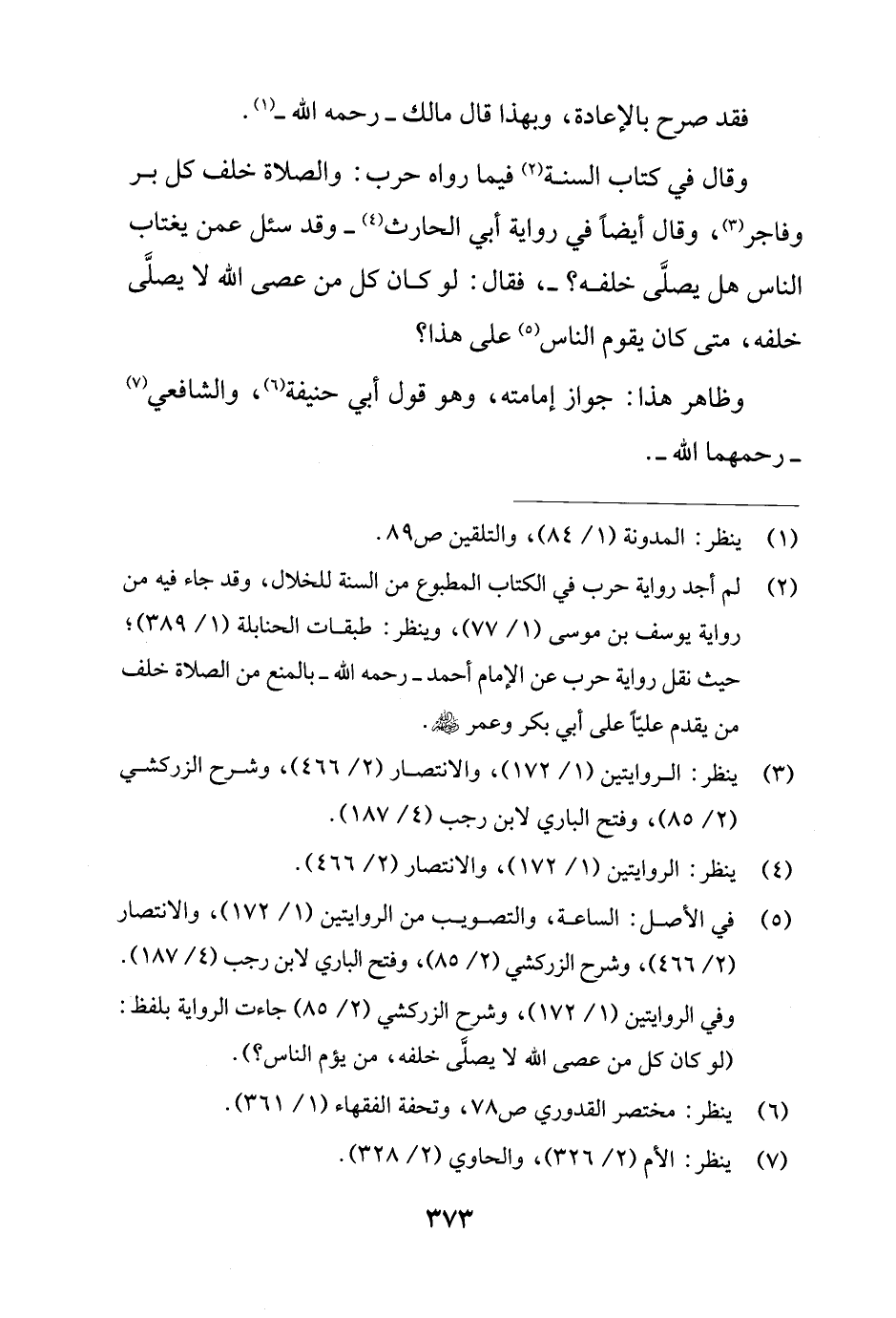 (¬5) في الأصل: الساعة، والتصويب من الروايتين (1/ 172)، والانتصار (2/ 466)، وشرح الزركشي (2/ 85)، وفتح الباري لابن رجب (4/ 187). وفي الروايتين (1/ 172)، وشرح الزركشي (2/ 85) جاءت الرواية بلفظ: (لو كان كل من عصى الله لا يصلَّى خلفه، من يؤم الناس؟ ).