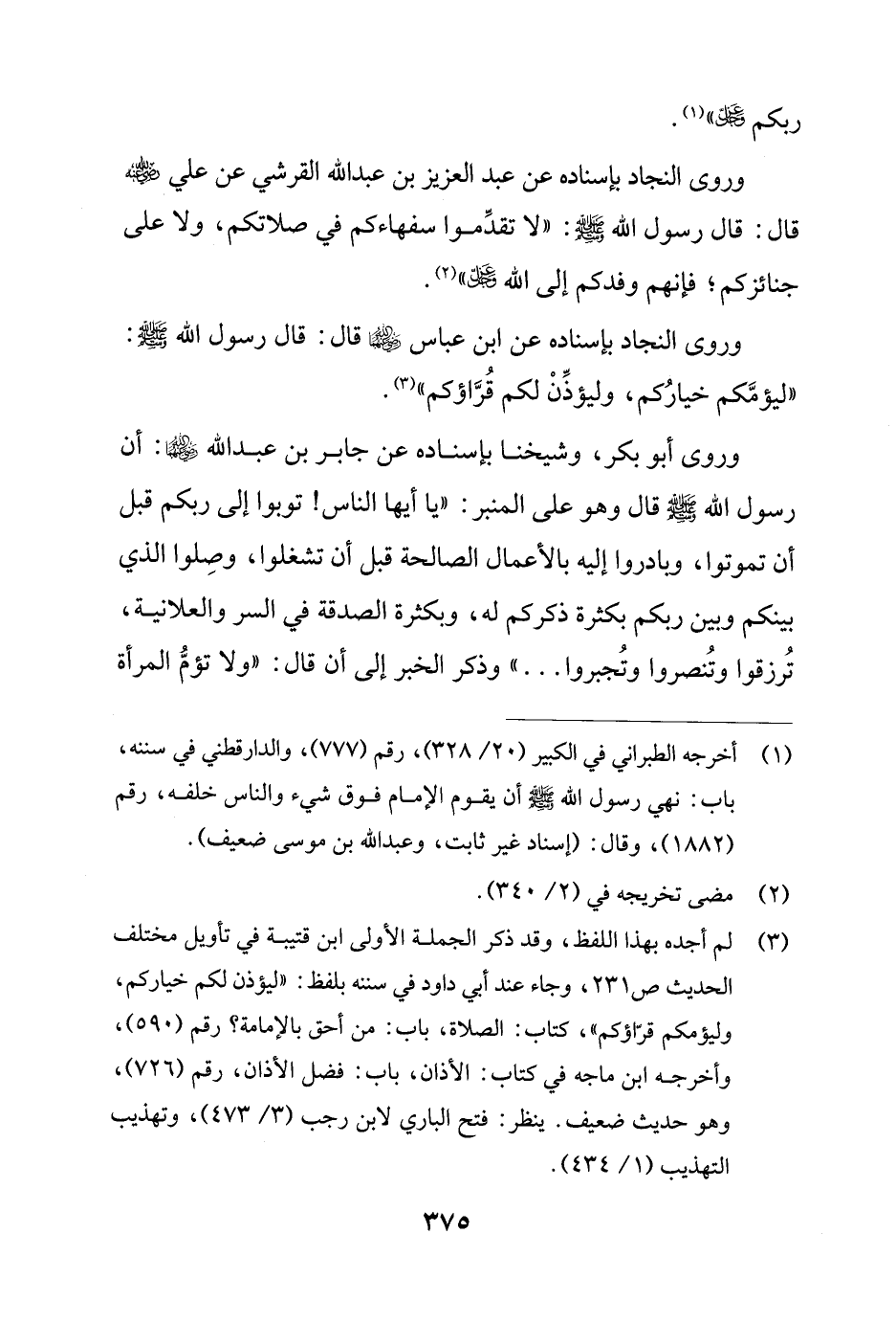 وروى النجاد بإسناده عن عبد العزيز بن عبد الله القرشي عن علي - رضي الله عنه - قال: قال رسول الله - صلى الله عليه وسلم -: "لا تقدِّموا سفهاءكم في صلاتكم، ولا على جنائزكم؛ فإنهم وفدكم إلى الله - عز وجل -" (¬2).