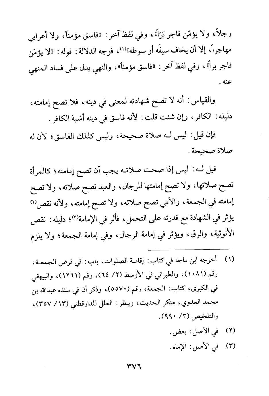 رجلًا، ولا يؤمّن فاجر بَرًّا"، وفي لفظ آخر: "فاسق مؤمنًا، ولا أعرابي مهاجرًا، إلا أن يخاف سيفَه أو سوطه" (¬1)، فوجه الدلالة: قوله: "لا يؤمّن فاجر برًا"، وفي لفظ آخر: "فاسق مؤمنًا"، والنهي يدل على فساد المنهي عنه.