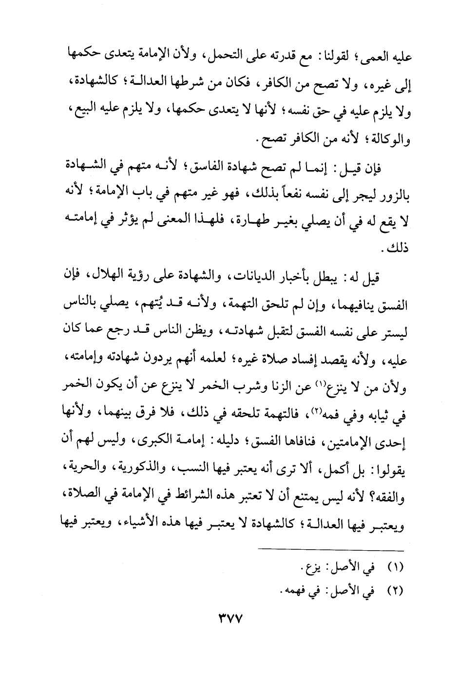قيل له: يبطل بأخبار الديانات، والشهادة على رؤية الهلال، فإن الفسق ينافيهما، وإن لم تلحق التهمة، ولأنه قد يُتهم، يصلي بالناس ليستر على نفسه الفسق لتقبل شهادته، ويظن الناس قد رجع عما كان عليه، ولأنه يقصد إفساد صلاة غيره؛ لعلمه أنهم يردون شهادته وإمامته، ولأن من لا ينزع (¬1) عن الزنا وشرب الخمر لا ينزع عن أن يكون الخمر في ثيابه وفي فمه (¬2)، فالتهمة تلحقه في ذلك، فلا فرق بينهما، ولأنها إحدى الإمامتين، فنافاها الفسق؛ دليله: إمامة الكبرى، وليس لهم أن يقولوا: بل أكمل، ألا ترى أنه يعتبر فيها النسب، والذكورية، والحرية، والفقه؟ لأنه ليس يمتنع أن لا تعتبر هذه الشرائط في الإمامة في الصلاة، ويعتبر فيها العدالة؛ كالشهادة لا يعتبر فيها هذه الأشياء، ويعتبر فيها