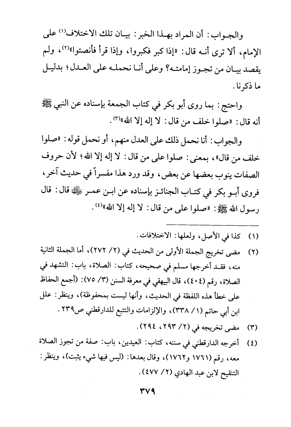 (¬4) أخرجه الدارقطني في سننه، كتاب: العيدين، باب: صفة من تجوز الصلاة معه، رقم (1761 و 1762)، وقال بعدها: (ليس فيها شيء يثبت)، وينظر: التنقيح لابن عبد الهادي (2/ 477).