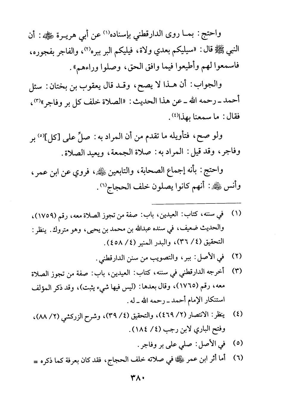 واحتج: بأنه إجماع الصحابة، والتابعين - رضي الله عنهم -، فروي عن ابن عمر، وأنس - رضي الله عنهم -: أنهم كانوا يصلون خلف الحجاج (¬6).
