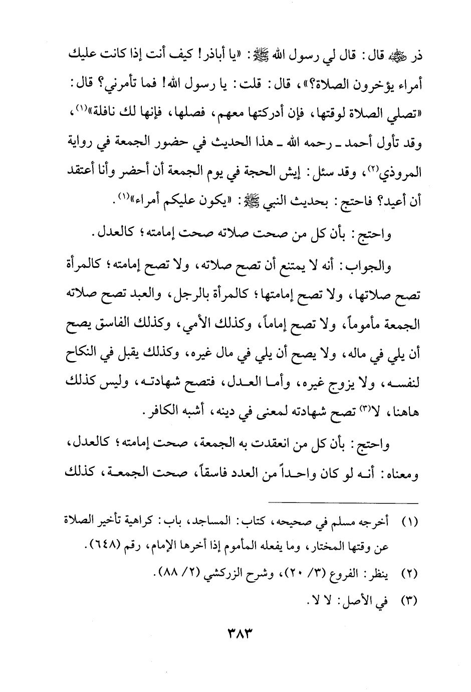 ذر - رضي الله عنه - قال: قال لي رسول الله - صلى الله عليه وسلم -: "يا أبا ذر! كيف أنت إذا كانت عليك أمراء يؤخرون الصلاة؟ "، قال: قلت: يا رسول الله! فما تأمرني؟ قال: "تصلي الصلاة لوقتها، فإن أدركتها معهم، فصلها، فإنها لك نافلة" (¬1)، وقد تأول أحمد - رحمه الله - هذا الحديث في حضور الجمعة في رواية المروذي (¬2)، وقد سئل: إيش الحجة في يوم الجمعة أن أحضر وأنا أعتقد أن أعيد؟ فاحتج: بحديث النبي - صلى الله عليه وسلم -: "يكون عليكم أمراء" (1).