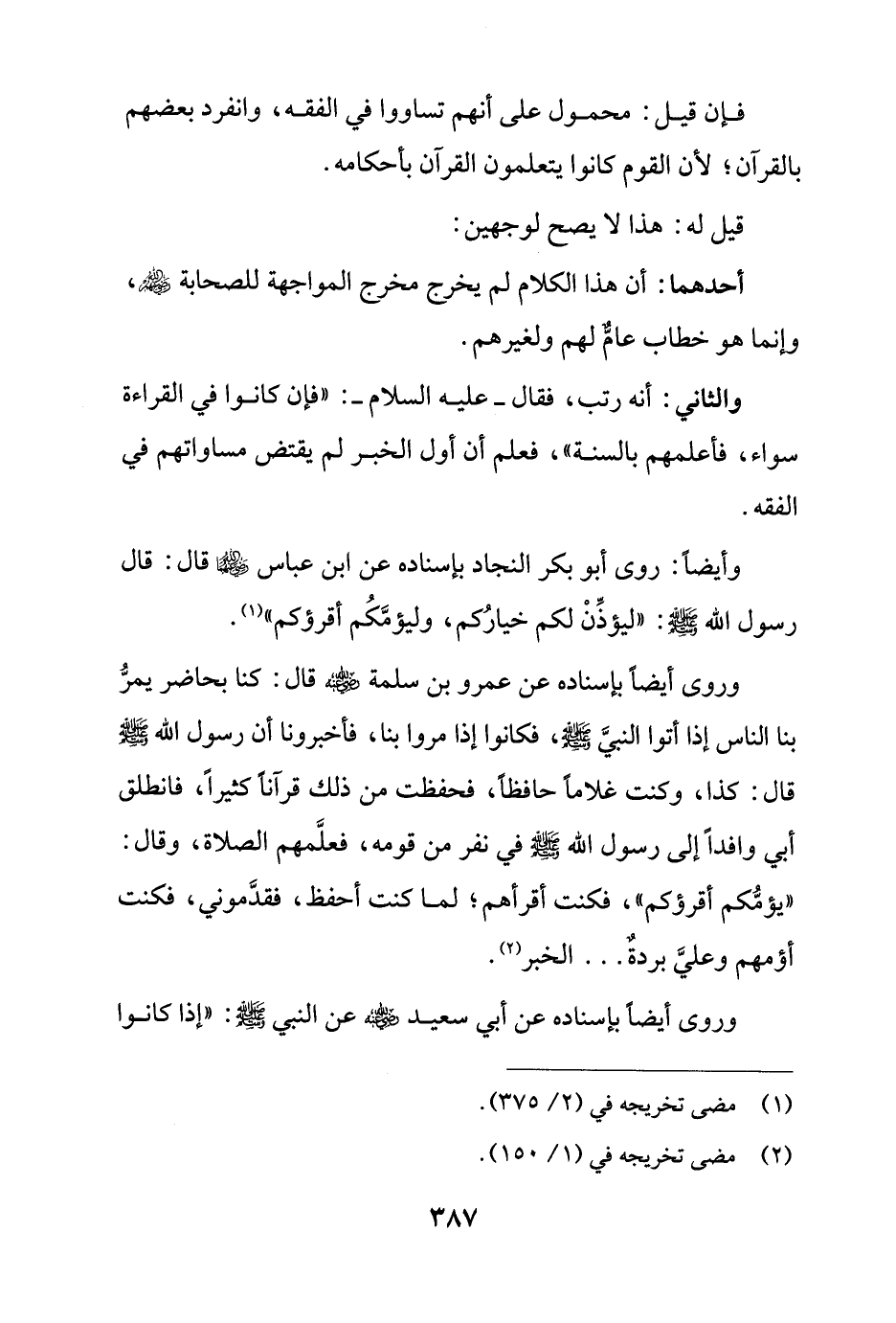 وروى أيضًا باسناده عن عمرو بن سلمة - رضي الله عنه - قال: كنا بحاضر يمرُّ بنا الناس إذا أتوا النبيَّ - صلى الله عليه وسلم -، فكانوا إذا مروا بنا، فأخبرونا أن رسول الله - صلى الله عليه وسلم - قال: كذا، وكنت غلامًا حافظًا، فحفظت من ذلك قرآنًا كثيرًا، فانطلق أبي وافدًا إلى رسول الله - صلى الله عليه وسلم - في نفر من قومه، فعلَّمهم الصلاة، وقال: "يؤمُّكم أقرؤكم"، فكنت أقرأهم؛ لما كنت أحفظ، فقدَّموني، فكنت أؤمهم وعليَّ بردةٌ ... الخبر (¬2).