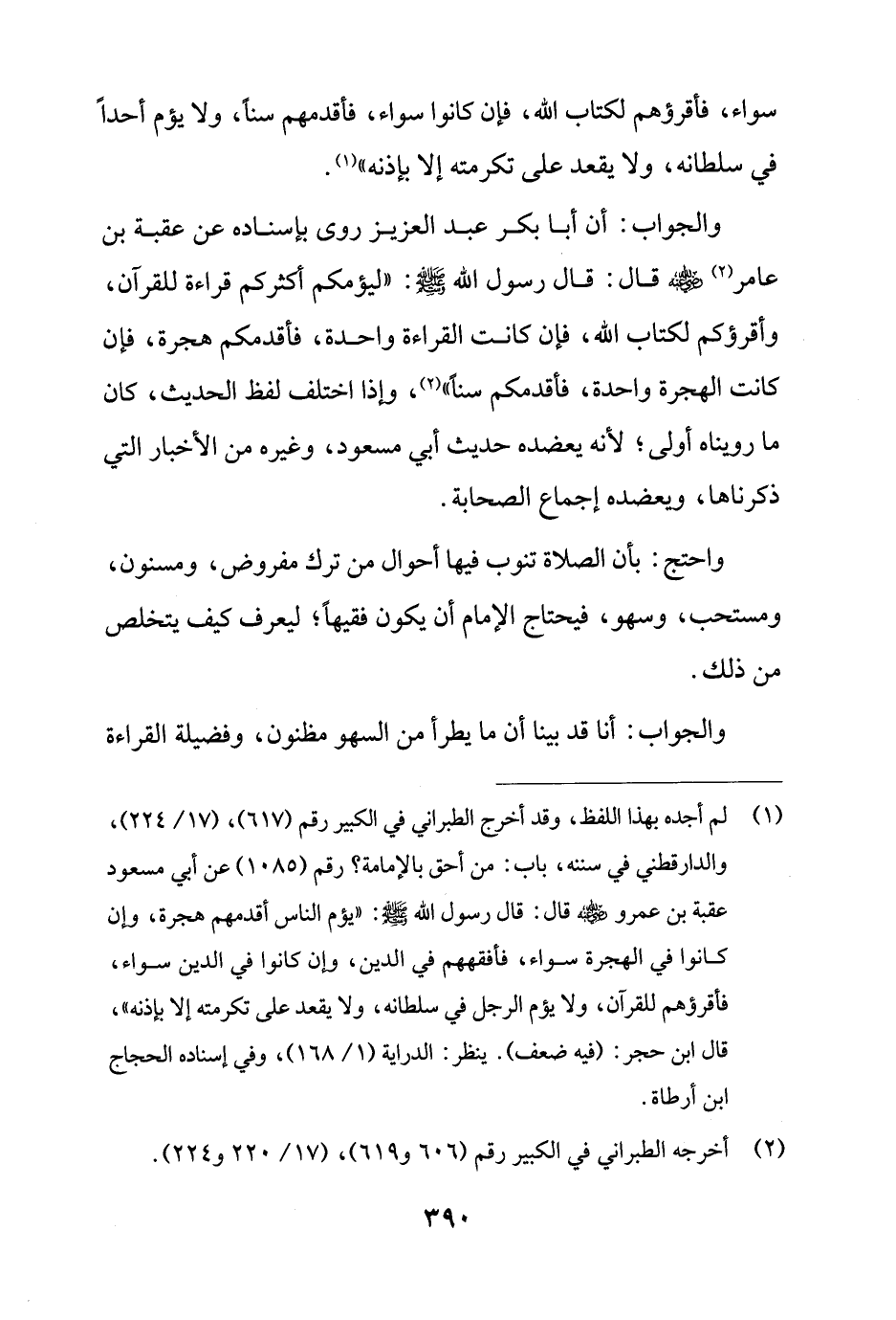 والجواب: أن أبا بكر عبد العزيز روى بإسناده عن عقبة بن عامر (¬2) - رضي الله عنه - قال: قال رسول الله - صلى الله عليه وسلم -: "ليؤمكم أكثركم قراءة للقرآن، وأقرؤكم لكتاب الله، فإن كانت القراءة واحدة، فأقدمكم هجرة، فإن كانت الهجرة واحدة، فأقدمكم سنًا" (2)، وإذا اختلف لفظ الحديث، كان ما رويناه أولى؛ لأنه يعضده حديث أبي مسعود، وغيره من الأخبار التي ذكرناها، ويعضده إجماع الصحابة.