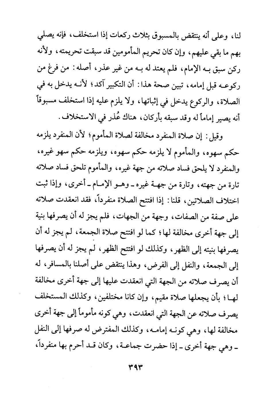 وقيل: إن صلاة المنفرد مخالفة لصلاة المأموم؛ لأن المنفرد يلزمه حكم سهوه، والمأموم لا يلزمه حكم سهوه، ويلزمه حكم سهو غيره، والمنفرد لا يلحق فساد صلاته من جهة غيره، والمأموم تلحق فساد صلاته تارة من جهته، وتارة من جهة غيره - وهو الإمام - أخرى، وإذا ثبت اختلاف الصلاتين، قلنا: إذا افتتح الصلاة منفردًا، فقد انعقدت صلاته على صفة من الصفات، وجهة من الجهات، فلم يجز له أن يصرفها بنية إلى جهة أخرى مخالفة لها؛ كما لو افتتح صلاة الجمعة، لم يجز له أن يصرفها بنيته إلى الظهر، وكذلك لو افتتح الظهر، لم يجز له أن يصرفها إلى الجمعة، والنفل إلى الفرض، وهذا ينتقض على أصلنا بالمسافر، له أن يصرف صلاته من الجهة التي انعقدت عليها إلى جهة أخرى مخالفة لها؛ بأن يجعلها صلاة مقيم، وإن كانا مختلفين، وكذلك المستخلف يصرف صلاته عن الجهة التي انعقدت، وهي كونه مأمومًا إلى جهة أخرى مخالفة لها، وهي كونه إمامه، وكذلك المفترض له صرفها إلى النفل - وهي جهة أخرى - إذا حضرت جماعة، وكان قد أحرم بها منفردًا،