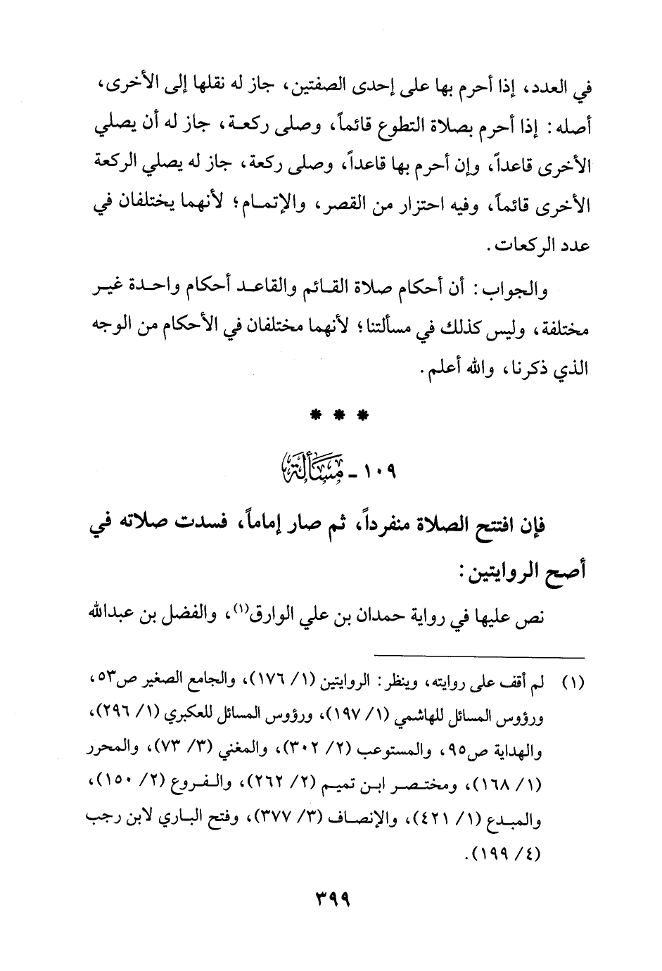 109 - مَسْألَة: فإن افتتح الصلاة منفردًا، ثم صار إمامًا، فسدت صلاته في أصح الروايتين: