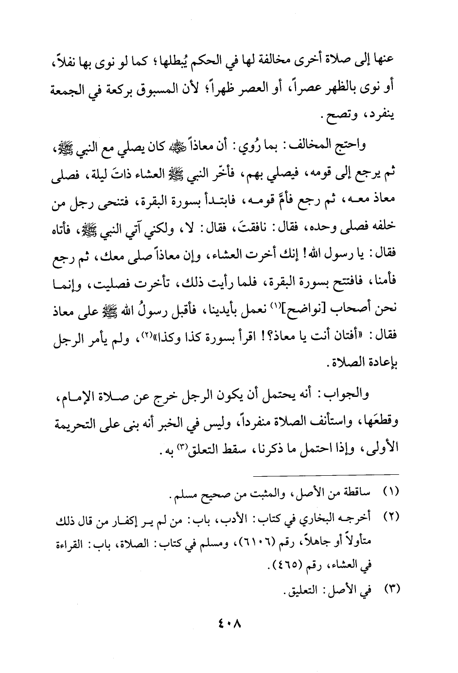 واحتج المخالف: بما رُوي: أن معاذًا - رضي الله عنه - كان يصلي مع النبي - صلى الله عليه وسلم -، ثم يرجع إلى قومه، فيصلي بهم، فأخّر النبي - صلى الله عليه وسلم - العشاء ذاتَ ليلة، فصلى معاذ معه، ثم رجع فأمَّ قومه، فابتدأ بسورة البقرة، فتنحى رجل من خلفه فصلى وحده، فقال: نافقتَ، فقال: لا، ولكني آتي النبي - صلى الله عليه وسلم -، فأتاه فقال: يا رسول الله! إنك أخرت العشاء، وإن معاذًا صلى معك، ثم رجع فأمنا، فافتتح بسورة البقرة، فلما رأيت ذلك، تأخرت فصليت، وإنما نحن أصحاب [نواضح] (¬1) نعمل بأيدينا، فأقبل رسولُ الله - صلى الله عليه وسلم - على معاذ فقال: "أفتان أنت يا معاذ؟ ! اقرأ بسورة كذا وكذا" (¬2)، ولم يأمر الرجل بإعادة الصلاة.
