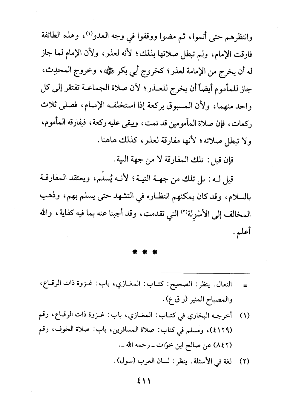 وانتظرهم حتى أتموا، ثم مضوا ووقفوا في وجه العدو (¬1)، وهذه الطائفة فارقت الإمام، ولم تبطل صلاتها بذلك؛ لأنه لعذر، ولأن الإمام لما جاز له أن يخرج من الإمامة لعذر؛ كخروج أبي بكر - رضي الله عنه -، وخروج المحدِث، جاز للمأموم أيضًا أن يخرج للعذر؛ لأن صلاة الجماعة تفتقر إلى كل واحد منهما، ولأن المسبوق بركعة إذا استخلفه الإمام، فصلى ثلاث ركعات، فإن صلاة المأمومين قد تمت، ويبقى عليه ركعة، فيفارقه المأموم، ولا تبطل صلاته؛ لأنها مفارقة لعذر، كذلك ها هنا.