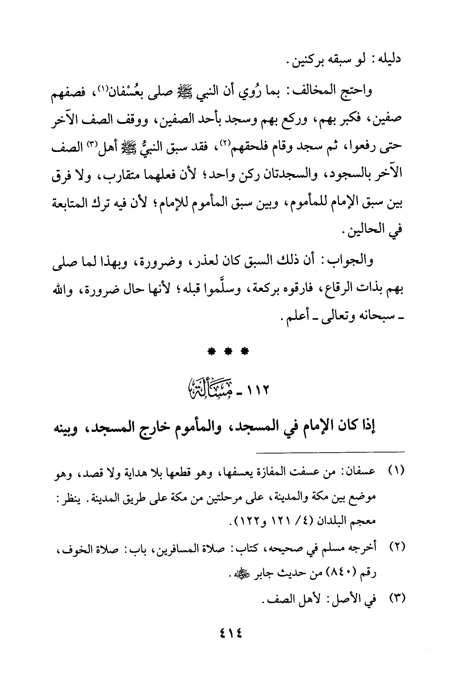 والجواب: أن ذلك السبق كان لعذر، وضرورة، وبهذا لما صلى بهم بذات الرقاع، فارقوه بركعة، وسلَّموا قبله؛ لأنها حال ضرورة، والله - سبحانه وتعالى - أعلم.